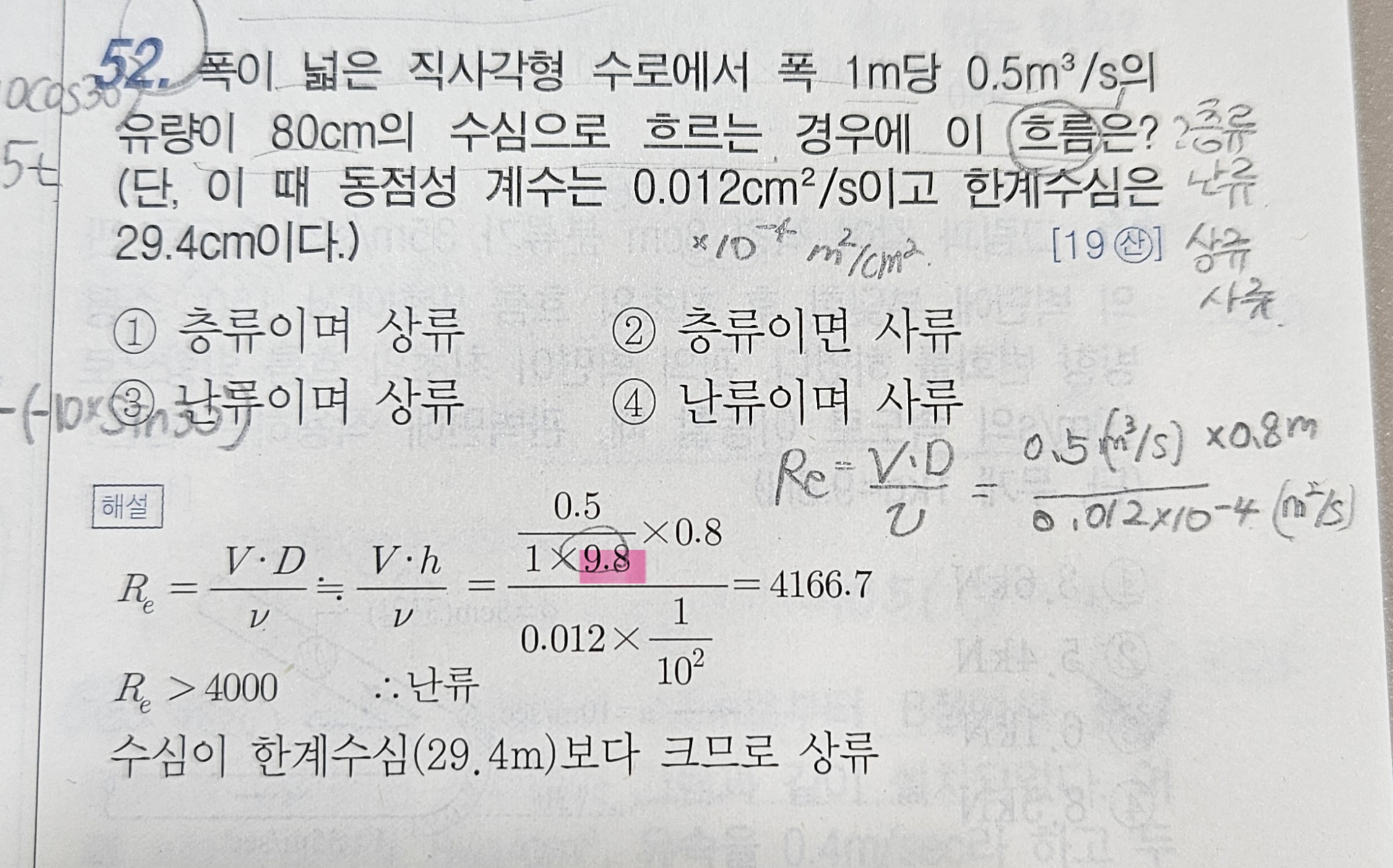 분모에 1×9.8을 1×0.8로 풀이하여야 하며 Re = 416666.67이 나오게 됩니다. 괄호에 한계수심은 29.4cm로 봐야 맞습니다.