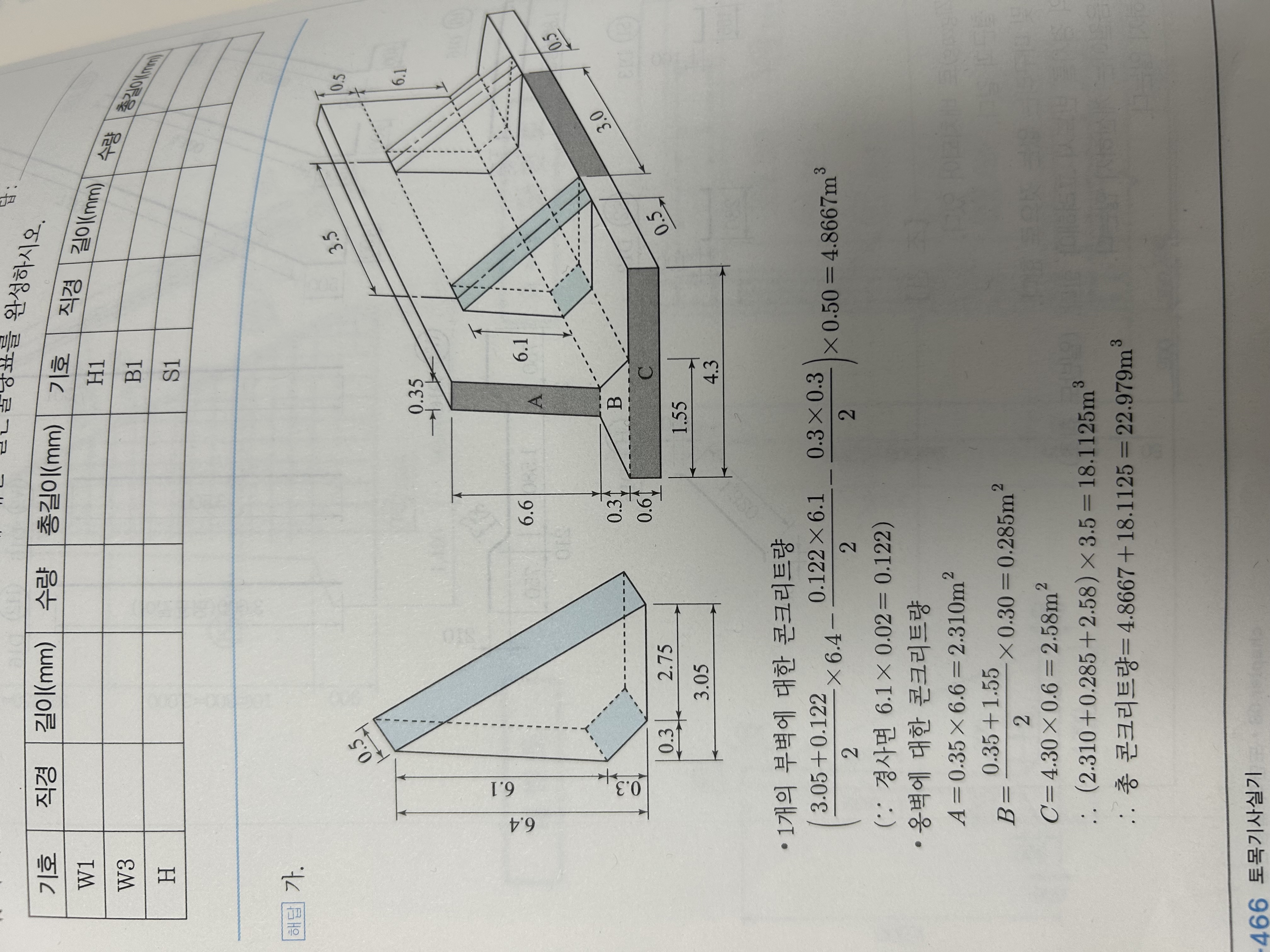 구배가 있는 옹벽의 부벽 면적산출 시 밑변길이3.05m에서 구배 부분 빼야하는 삼각형 면적의 밑변길이를 더하는 풀이가 보이는데