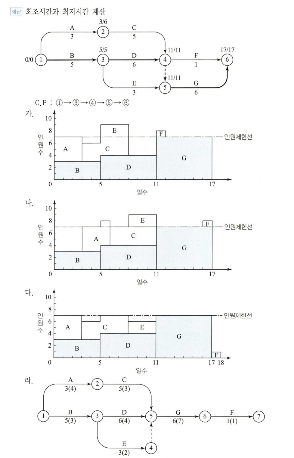 해당 문제에서 1일 작업인원이 7명으로 제한된 네트워크를 작성하려면 필히 C작업이 끝난 후에야 E작업이 가능하다고 생각하여 해설과는 다르게 위와 같이 작성하였습니다. 혹시 이렇게 작성하는 경우도 정답이 가능할찌 궁금합니다!