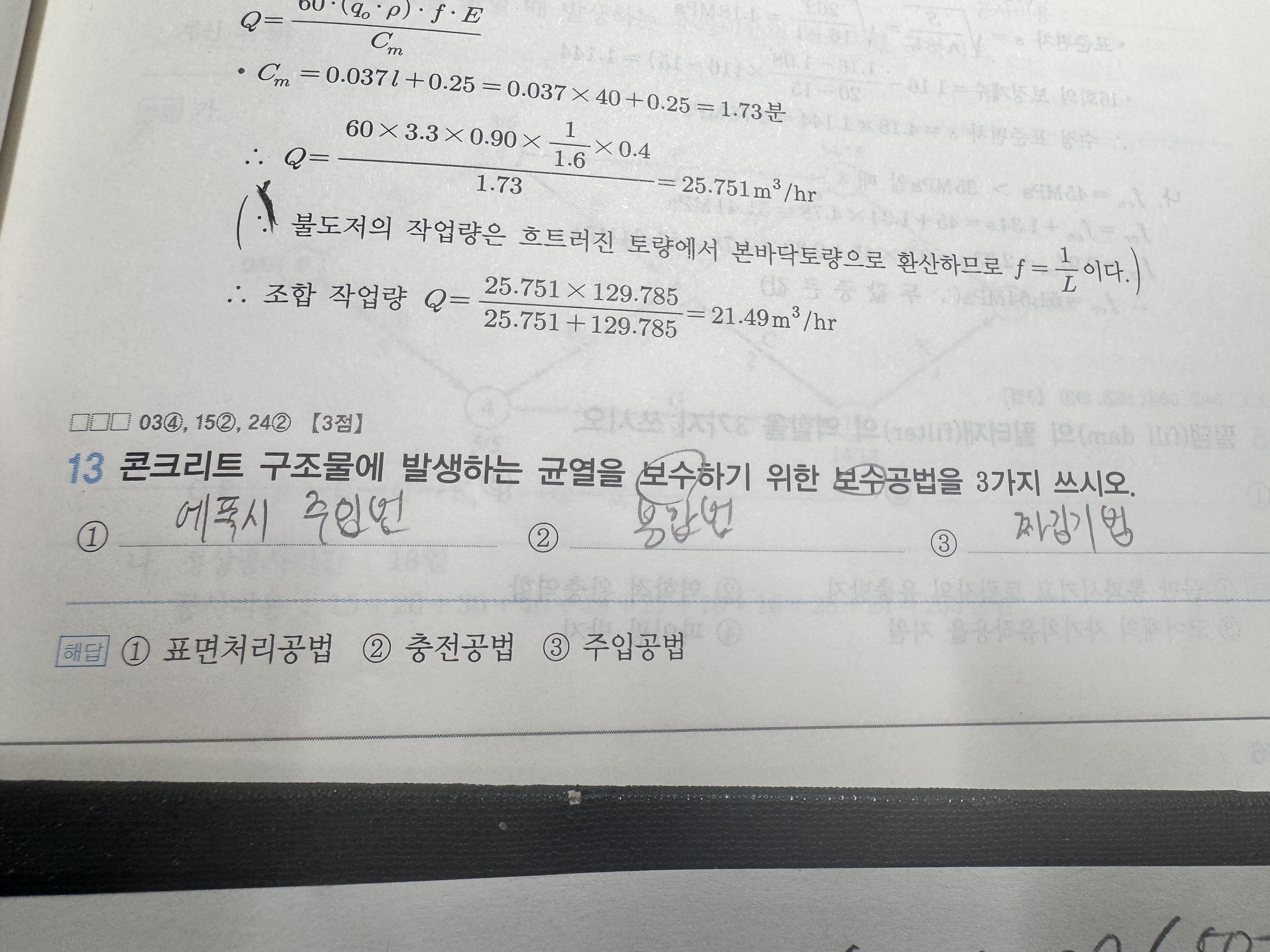 따라서 해당문제는 보수공법을 묻는 문제이므로 교재의 해설처럼 표면처리공법, 충전공법, 주입공법이라고 써야 합니다.