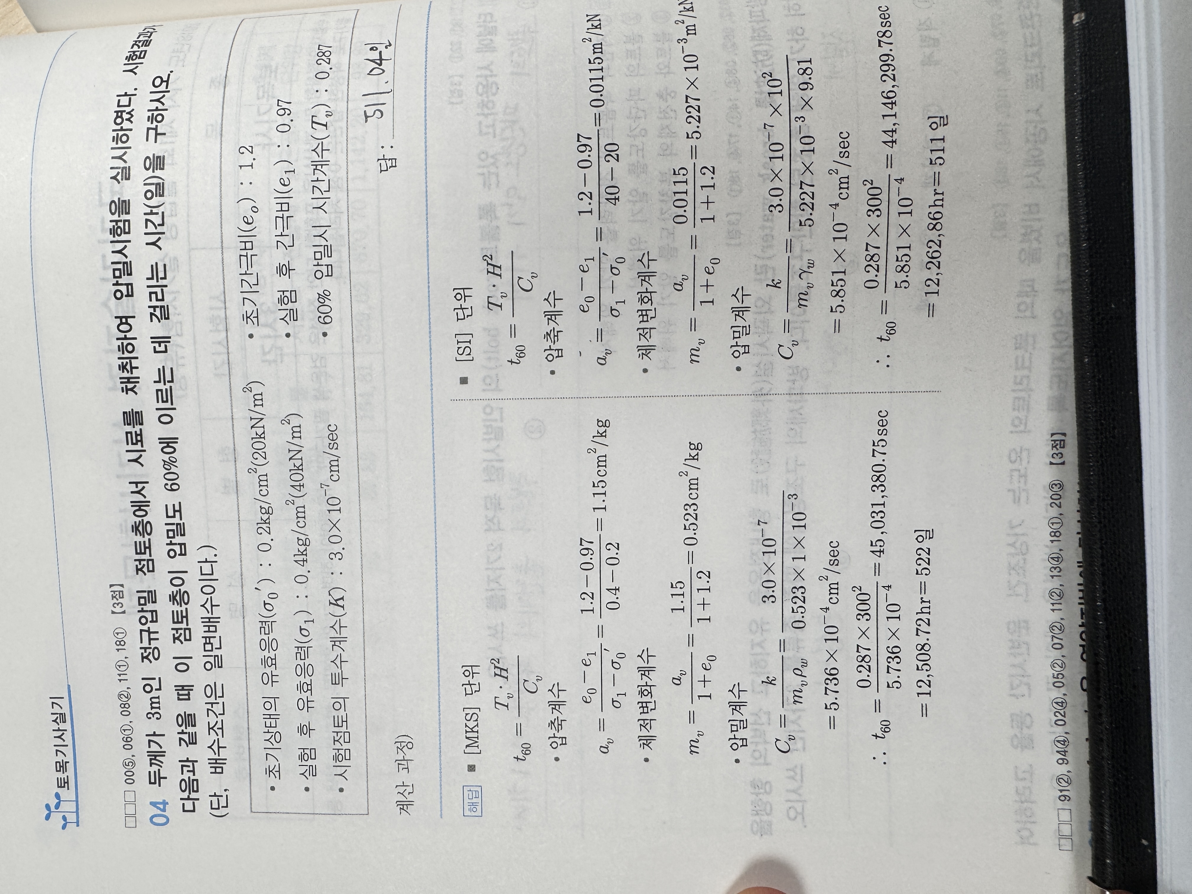 정수로 답을 쓸 경우 압밀소요일수를 구할 때는 안전측 설계를 위해서 소수점 아래 첫째자리에서 올림처리하여 정수로 쓰면 됩니다. 만약 문제에서 별도의 소수점 처리 기준이 주어지면 문제에서 주어진 처리기준을 적용하여 소수점을 처리해서 최종답을 써야 합니다.