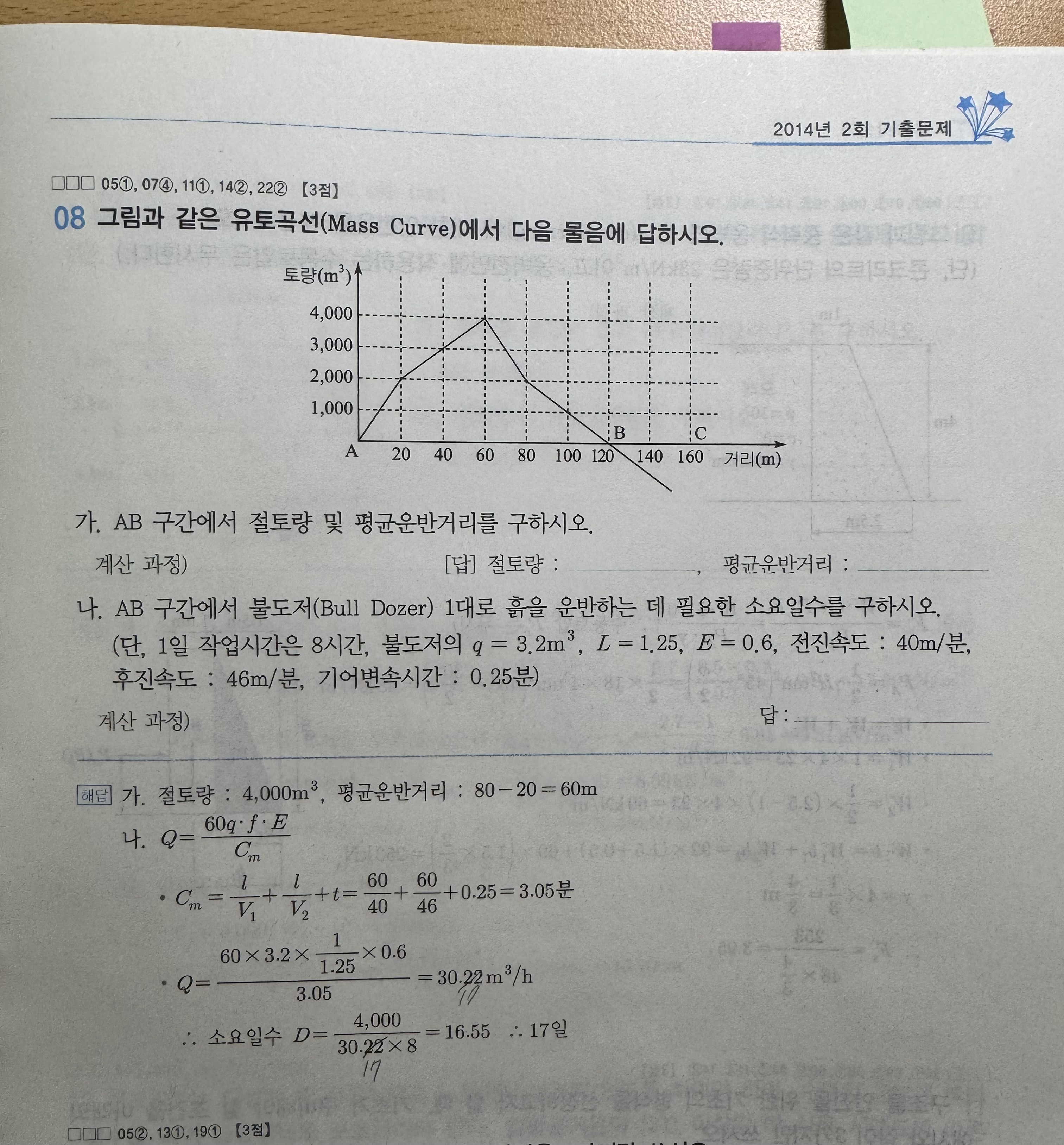 해당 문제의 해설은 소요일수를 계산할 때 불도저의 작업량을 자연상태로 적용하여 소요일수를 산정하기위해 절토량 4000을 그대로 적용한 것입니다.
