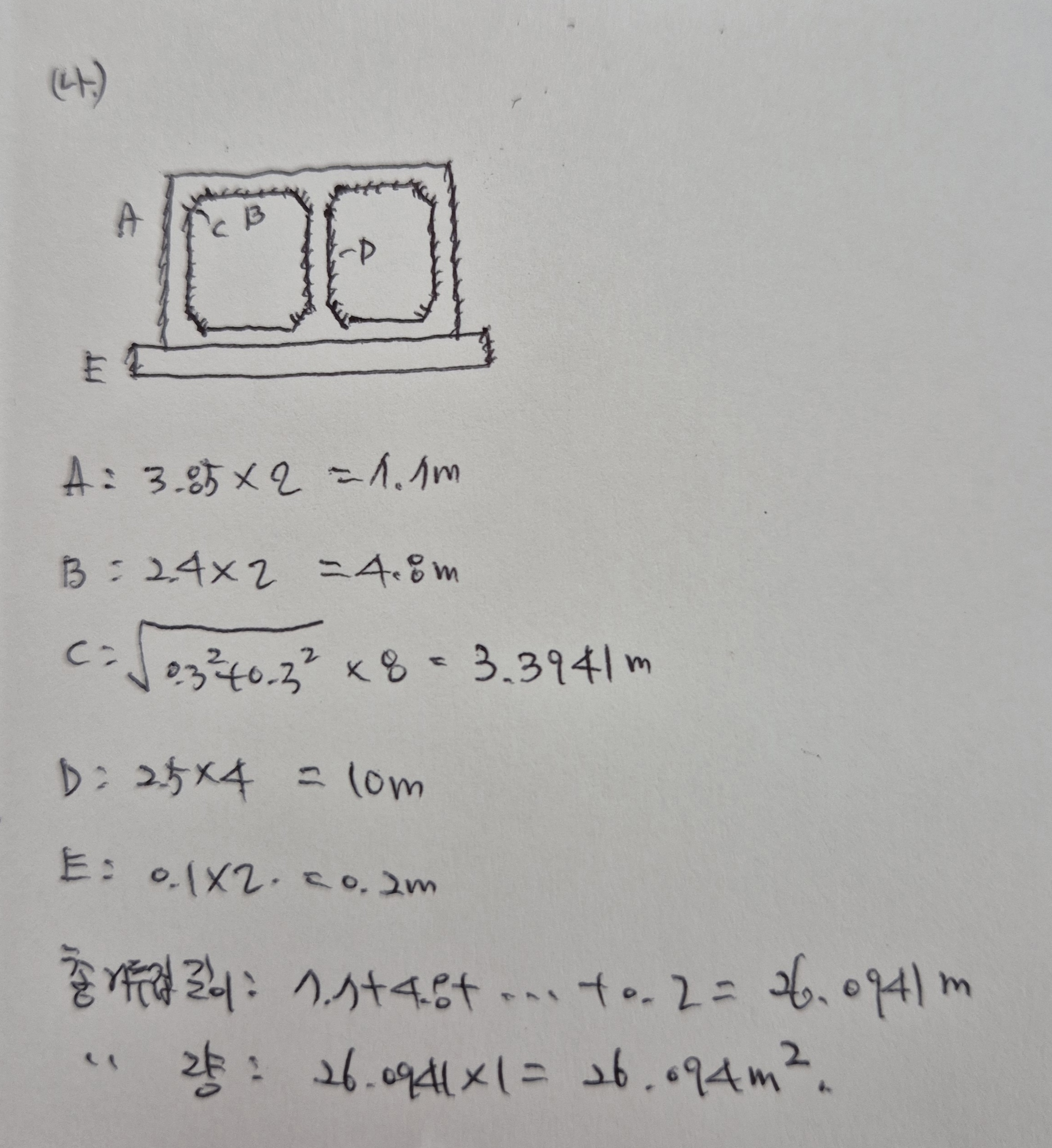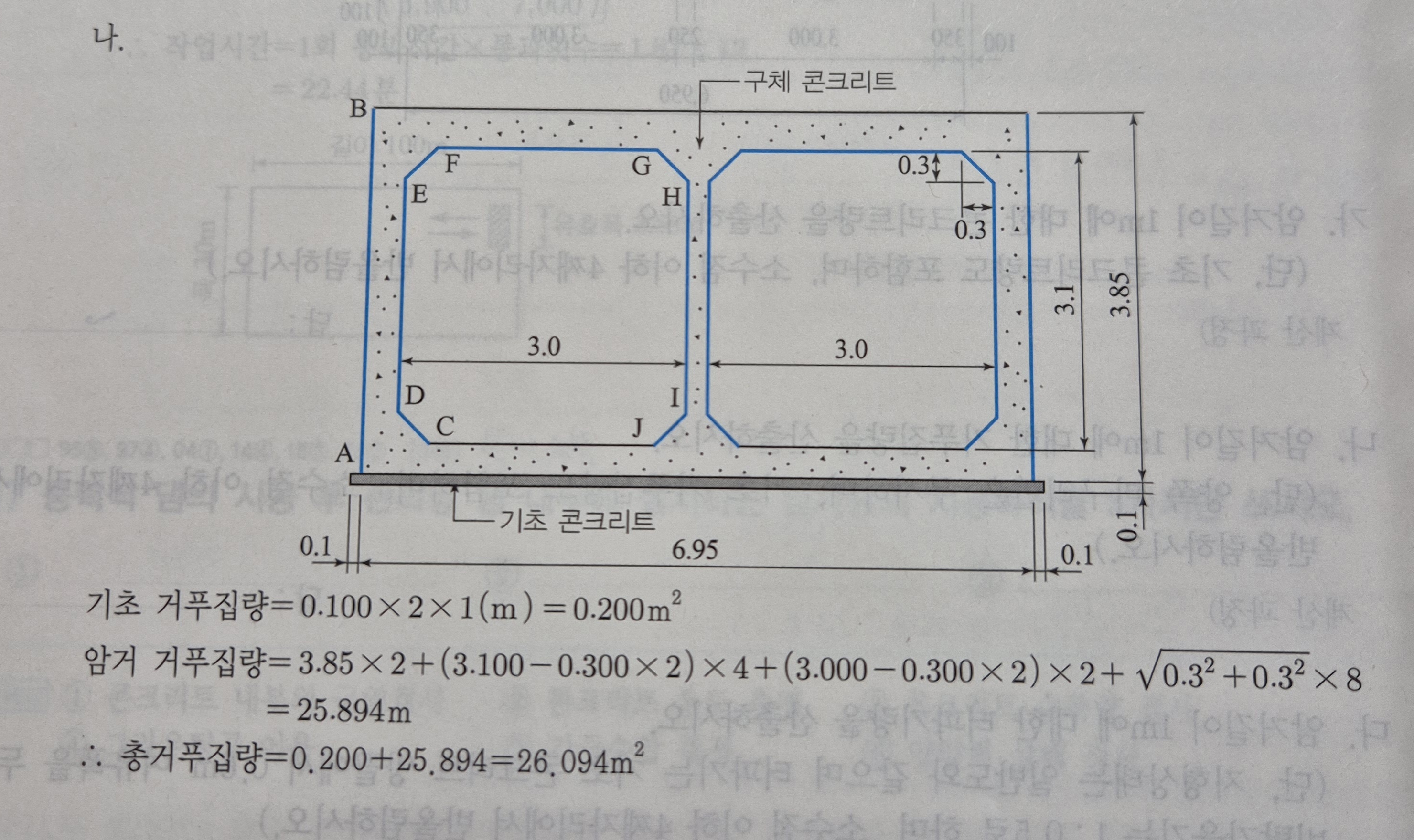 저는 암거와 기초의 거푸집길이를 한번에 구해서 마지막에 1m를 곱하는 방법으로 풀었습니다