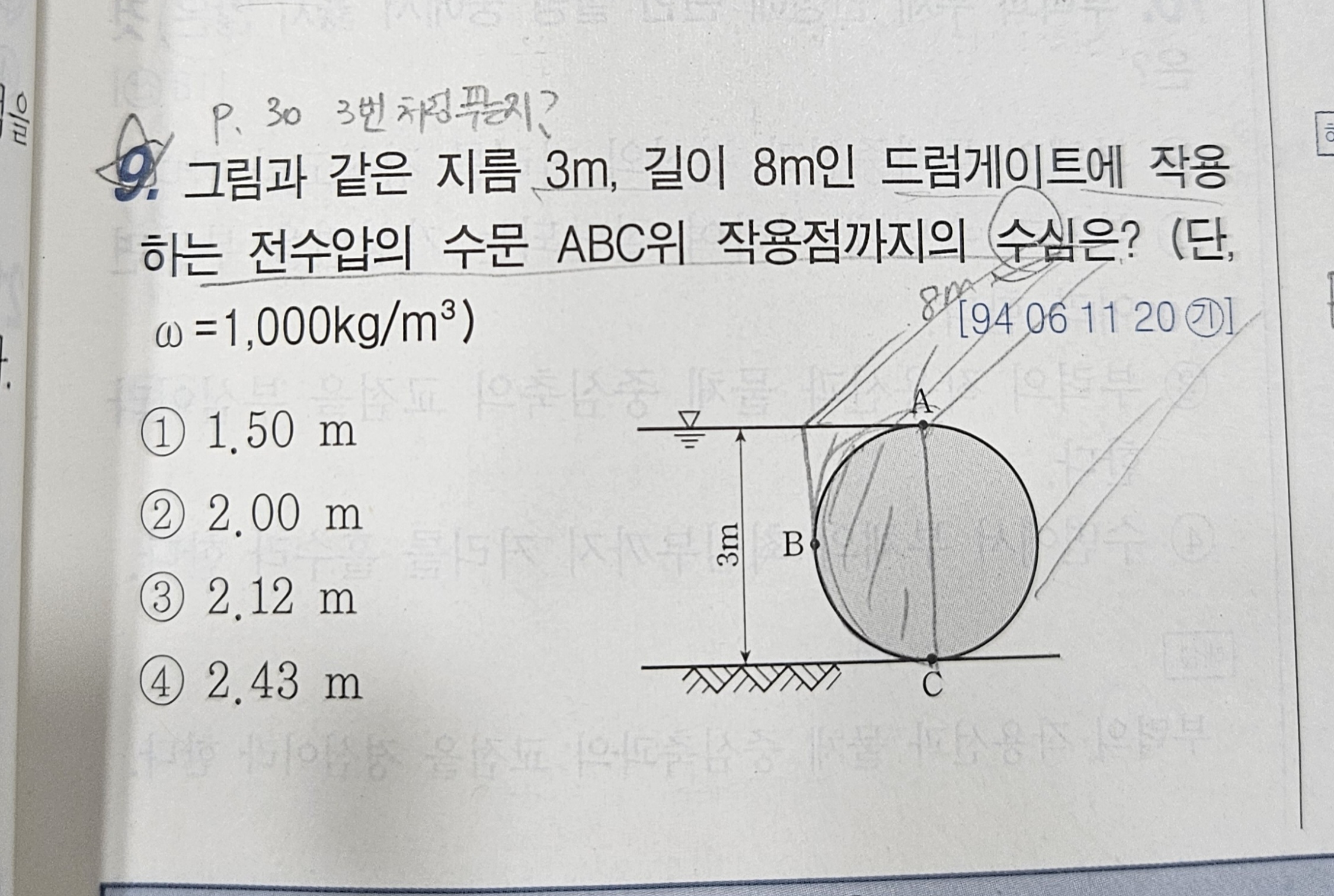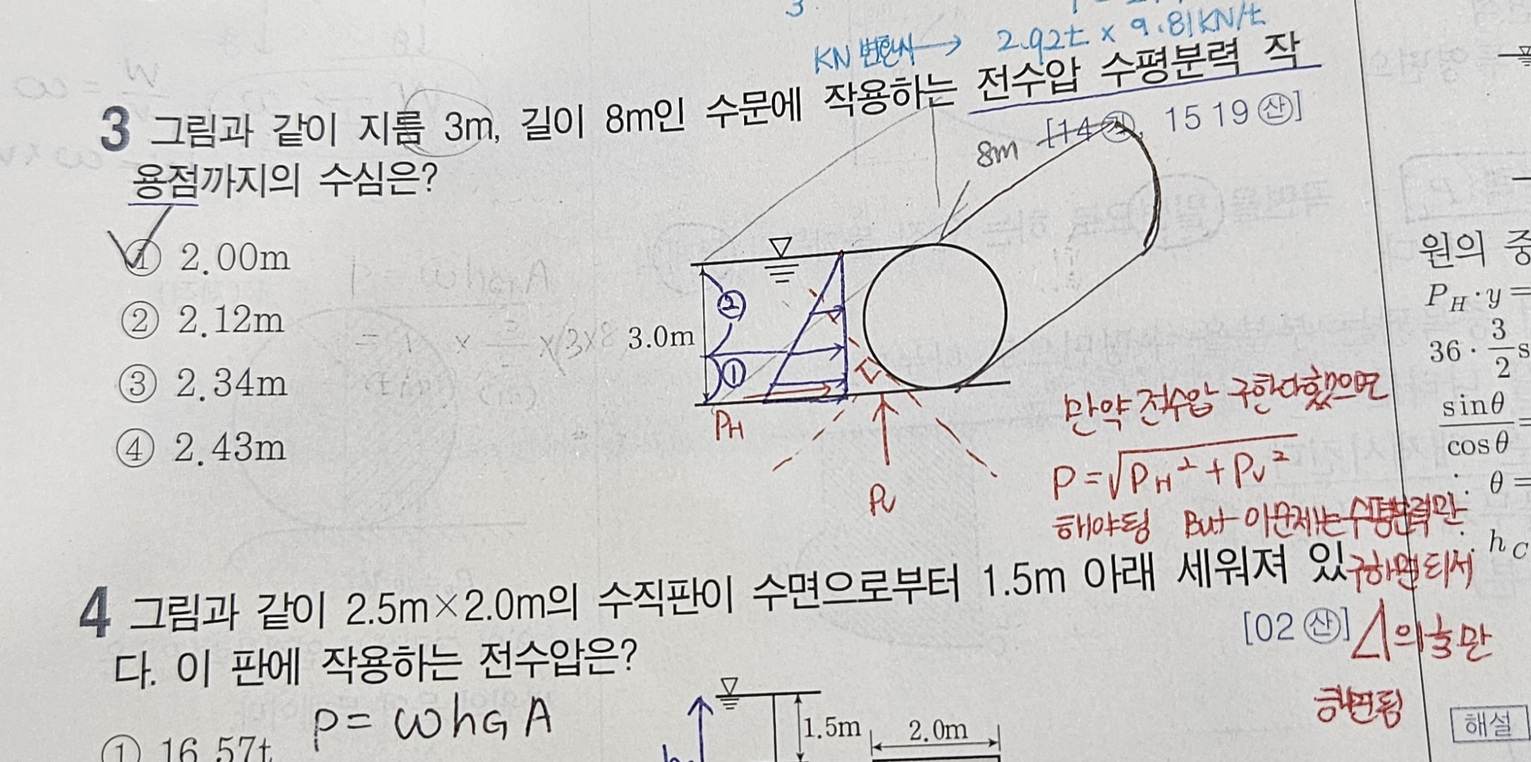 1. 3번문제의 해설은 전수압의 작용점까지의 수심을 구하는 내용으로 잘못된 해설입니다.
