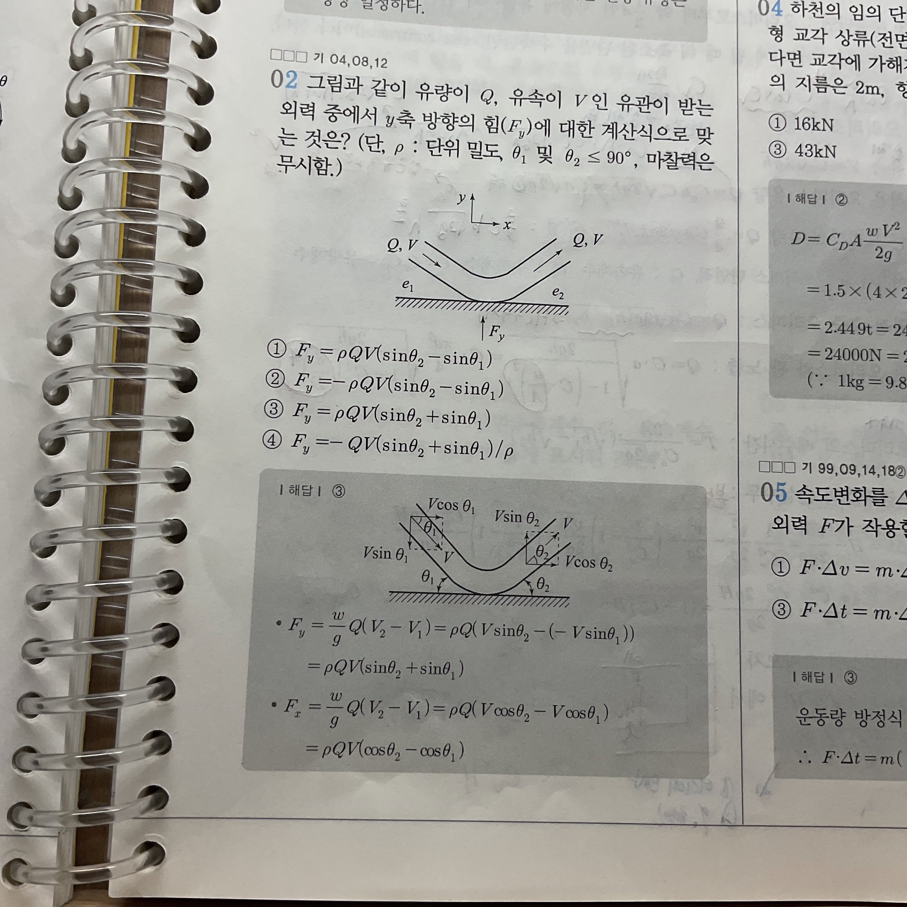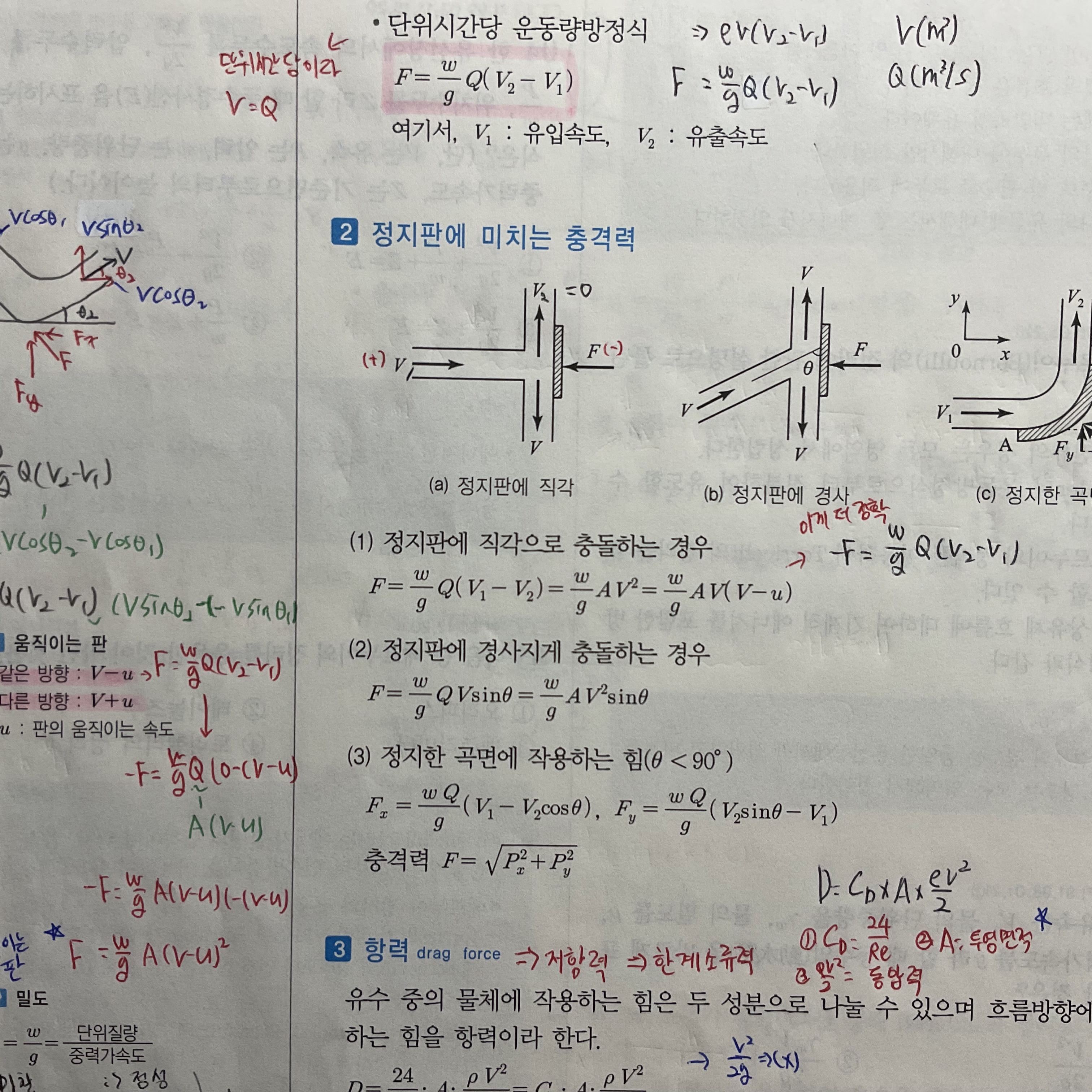 만약 그림 하단에 Fy처럼 Fx방향이 왼쪽방향 화살표가 조건에 주어진다면 충격판에 작용하는 반력으로 -를 붙혀서 계산하게 됩니다.
