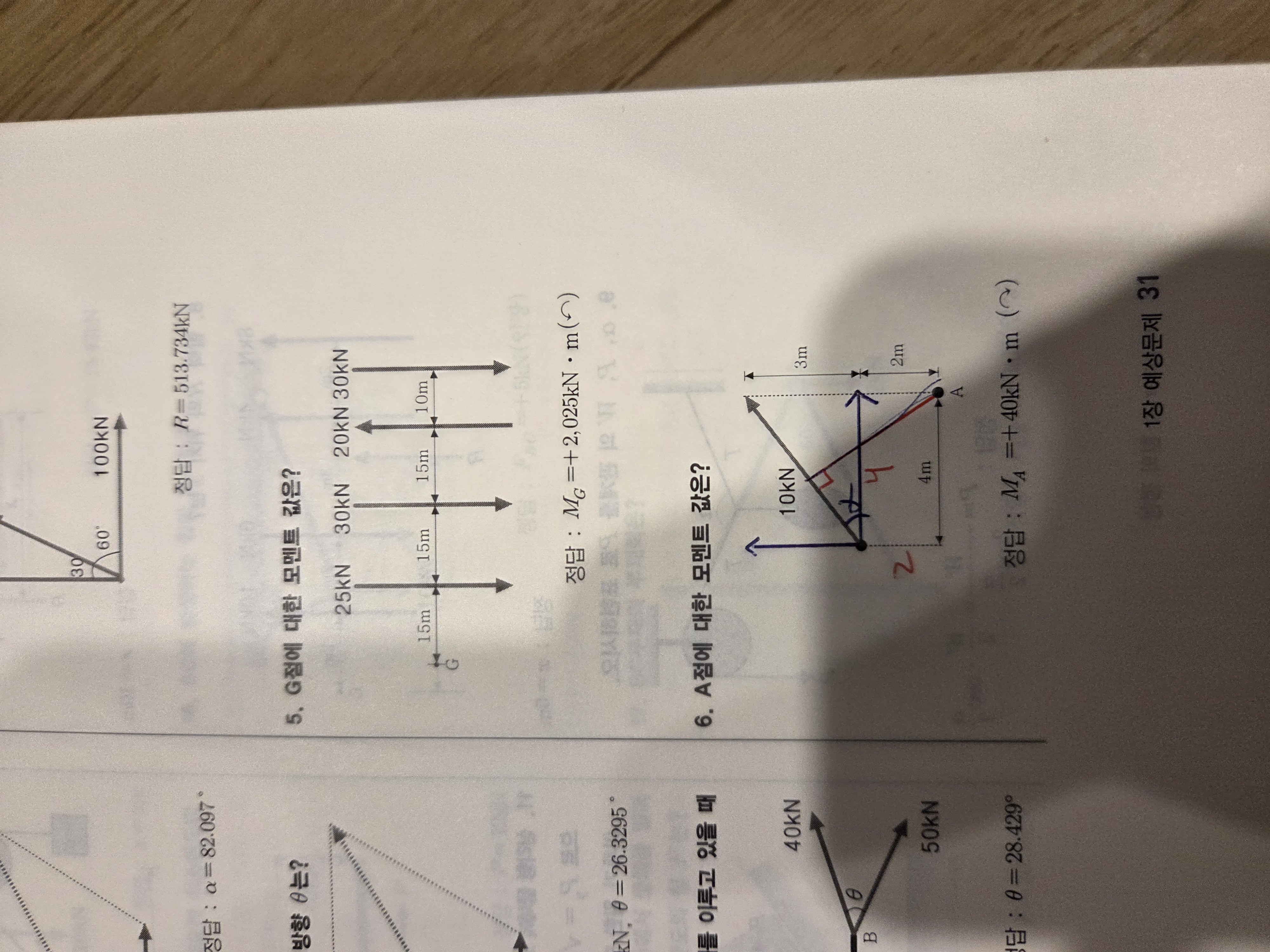 기초역학 1장 (힘의 평형) 연습문제 6번 (A점에 대한 모멘트 값은?)에 대한 상세한 문제풀이 및 설명 부탁드립니다.