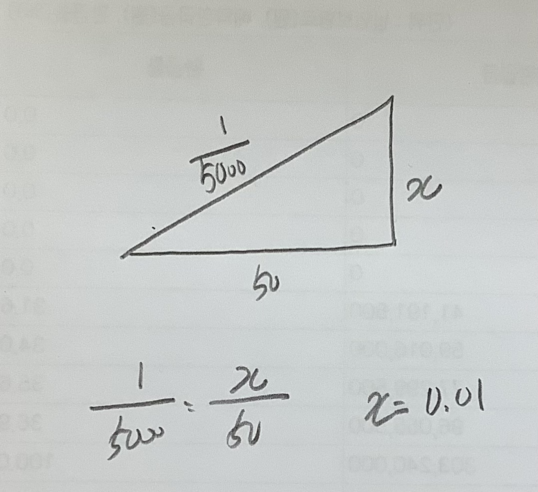 1/5000 = √(502+x2) - 50 나누기 50 그러므로 솔버를 실행하면 x=1.000049999가 나옵니다.