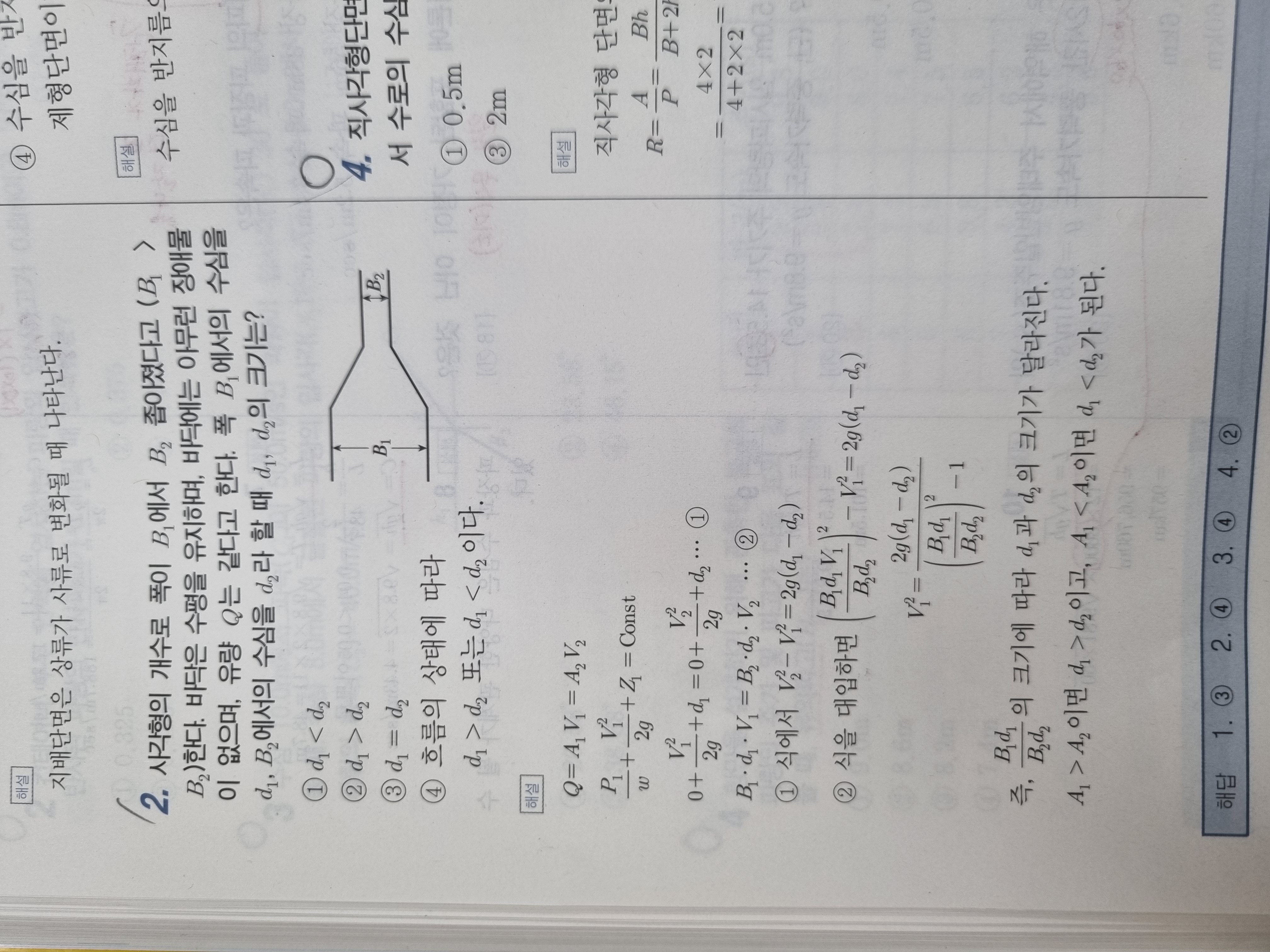 처음에 베르누이까지는 적용을 했는데, 해설에서 "2식을 대입하면~" 부터 이해가 되지 않습니다. 그리고 해설에 따르면 면적이나 크기에 따라 달라지는 것 같은데, 4번 답은 흐름의 상태에 따라 달라진다고 나와있어서 이 부분이 이해가 되지 않습니다.