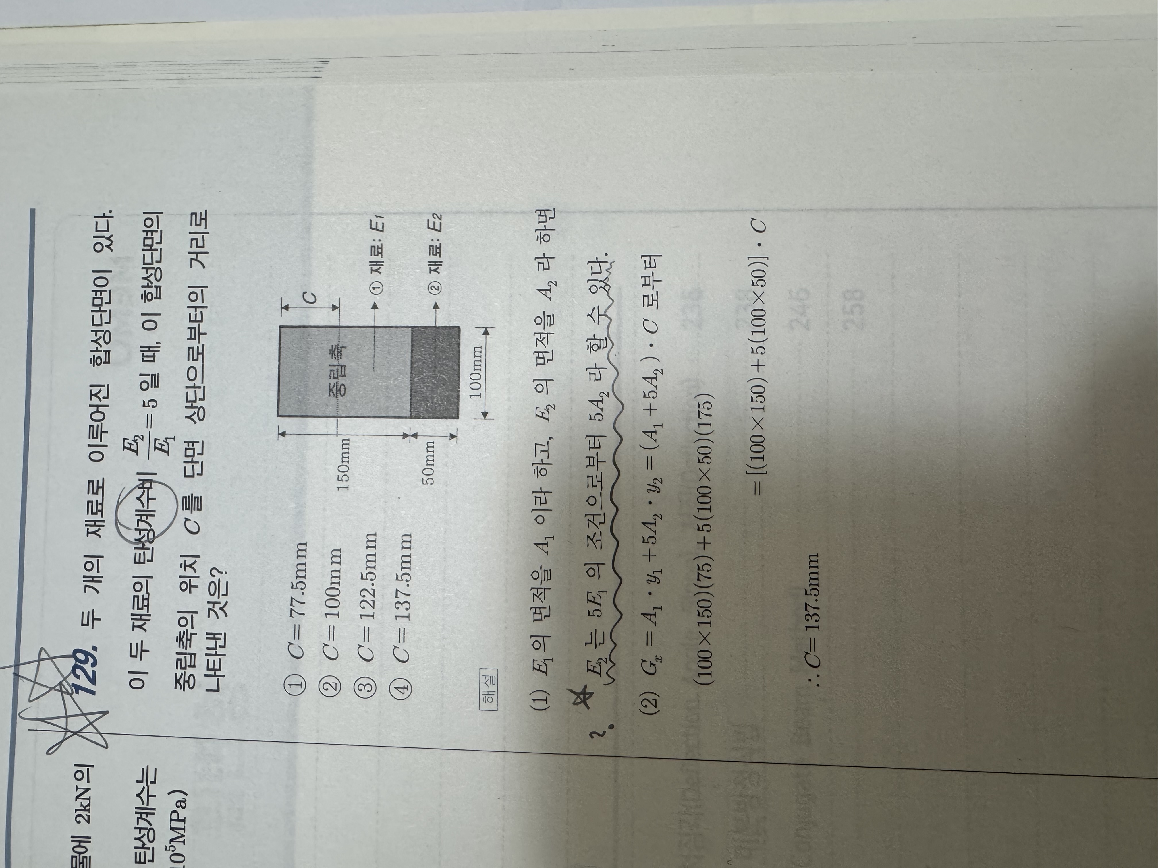문제의 조건에서 E2가 E1의 5배라는 탄성계수비의 조건을 내걸었기 때문에 이것을 반영한 내용이라고 보시면 되겠습니다.