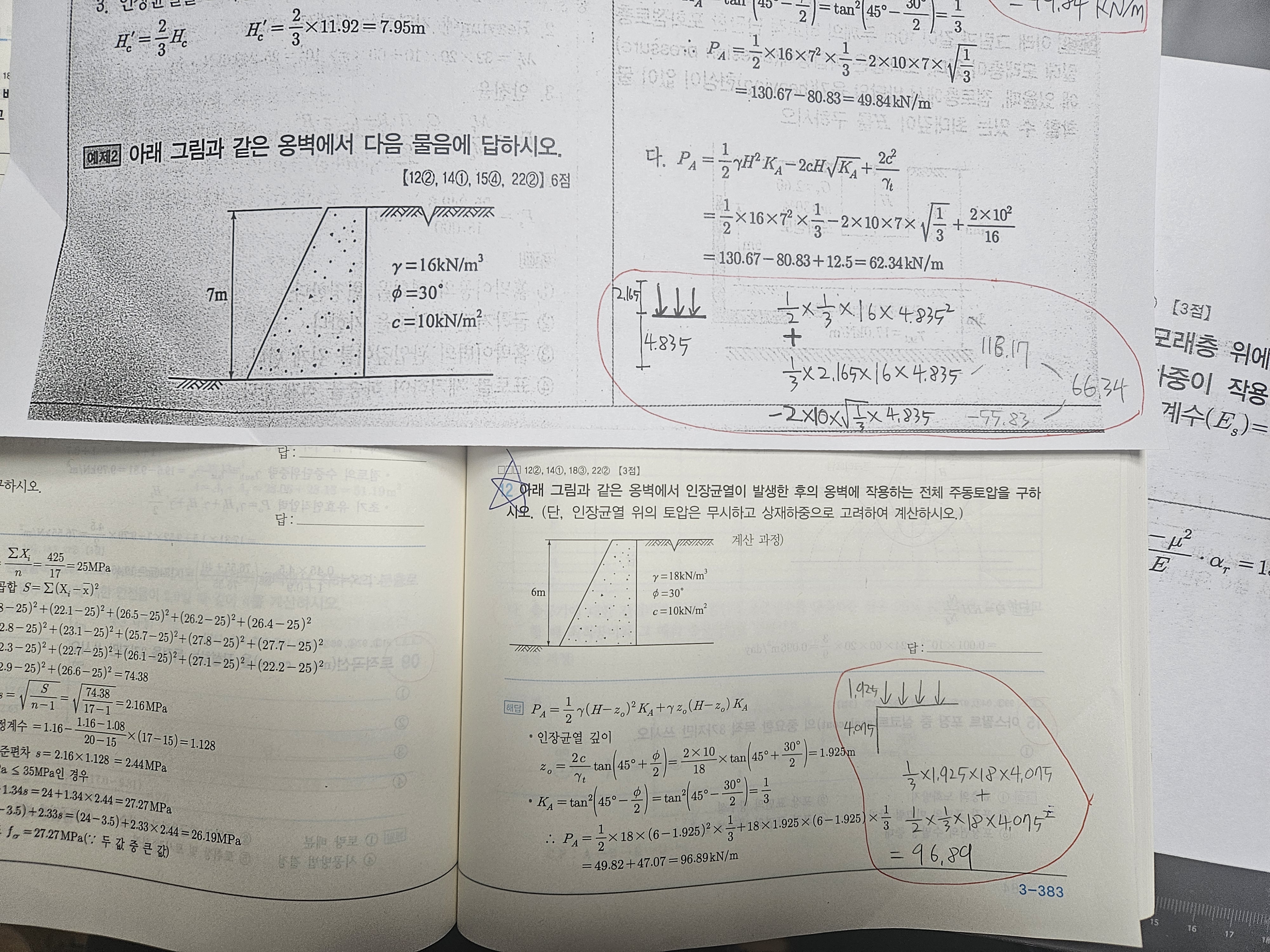 질문하신 두문제는 같아보이지만 12번 문제는 추가조건이 더 주어져 있습니다. (단, 인장균열 위의 토압은 무시하고 상재하중으로 고려하여 계산하시오)
