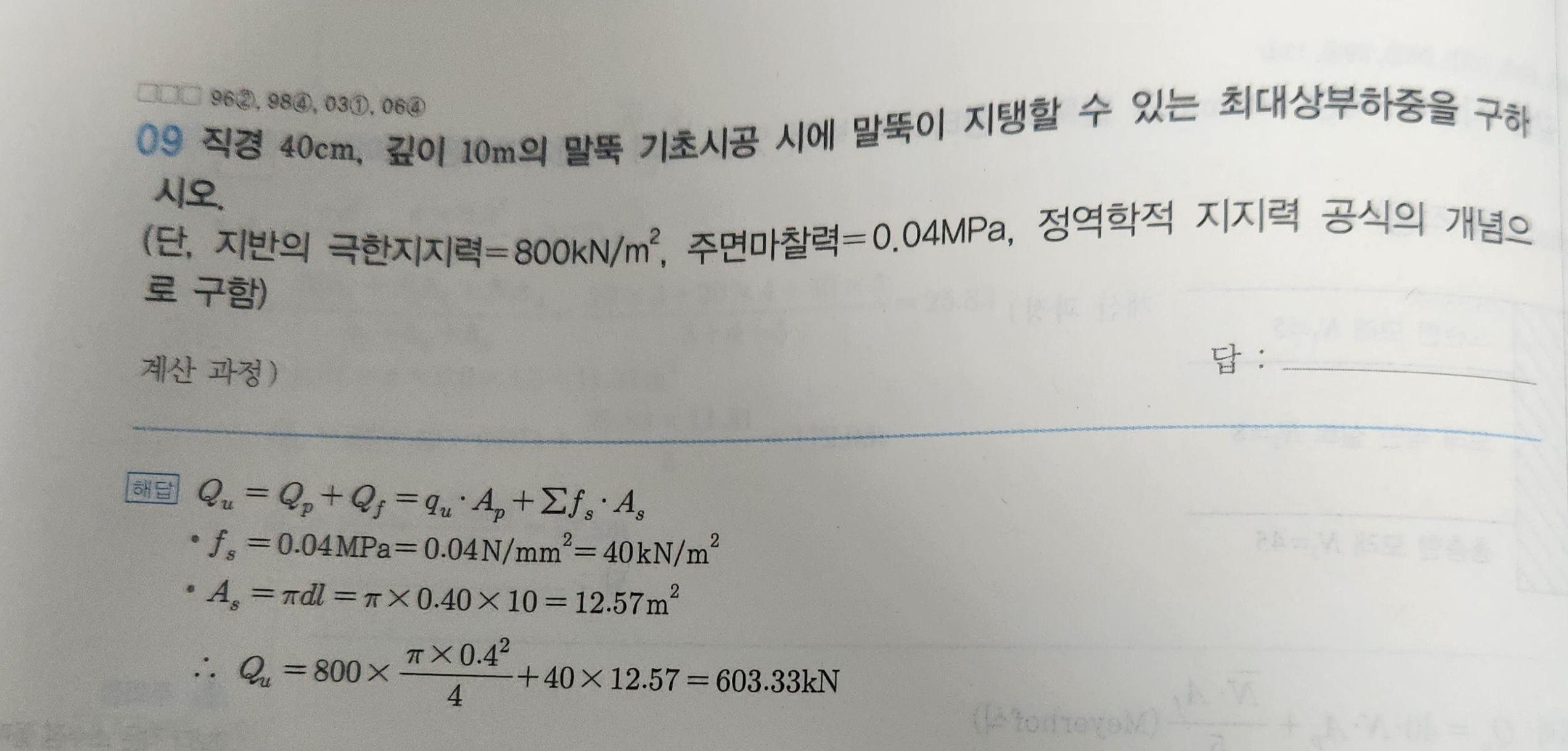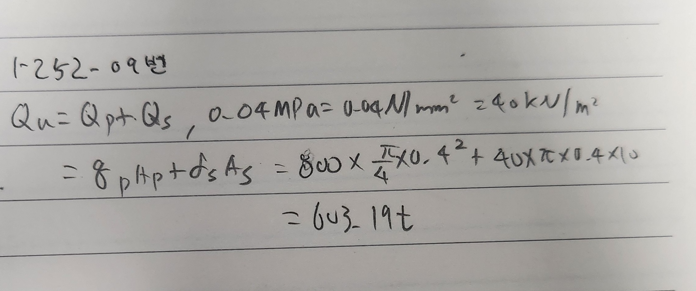 안녕하세요 교수님, 1권 문제회독을 하던 도중에 말뚝 극한지지력 값오차가 생각보다 커서 질문을 드리게 됐습니다 문제에선 표면적을 따로 계산한 다음에 반올림을 하고 극한지지력을 계산하던데,