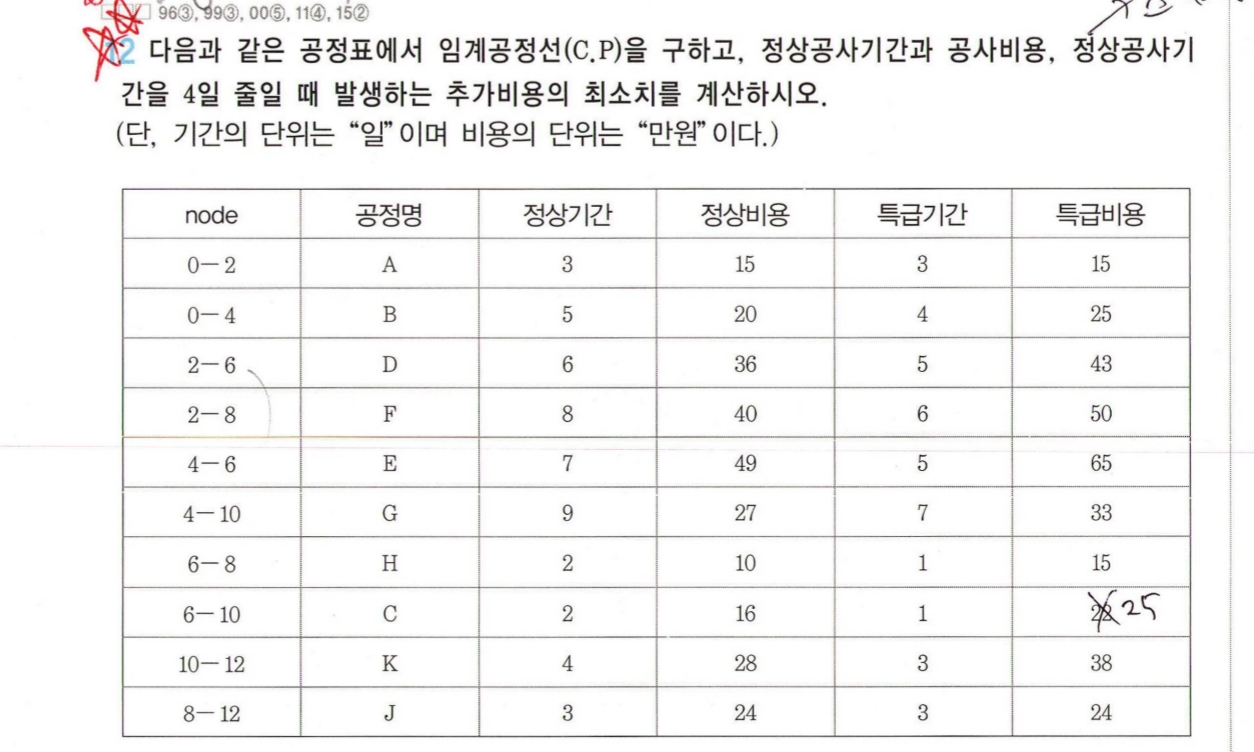 공정 문제 강의중에 특이하다고 비용이 작은거 부터 줄이는게 원칙이지만 이건 외우리고 하신 문제 알 수있을까요? 그게 혹시 이 문제인가요? 15년도 20년도 기출에는 c공정 특급비용이 25였습니다 문제오류라 생각하여 큐넷에서 수정한건지 특급비용이 22만원인 문제가 따로있는건지 궁금합니다