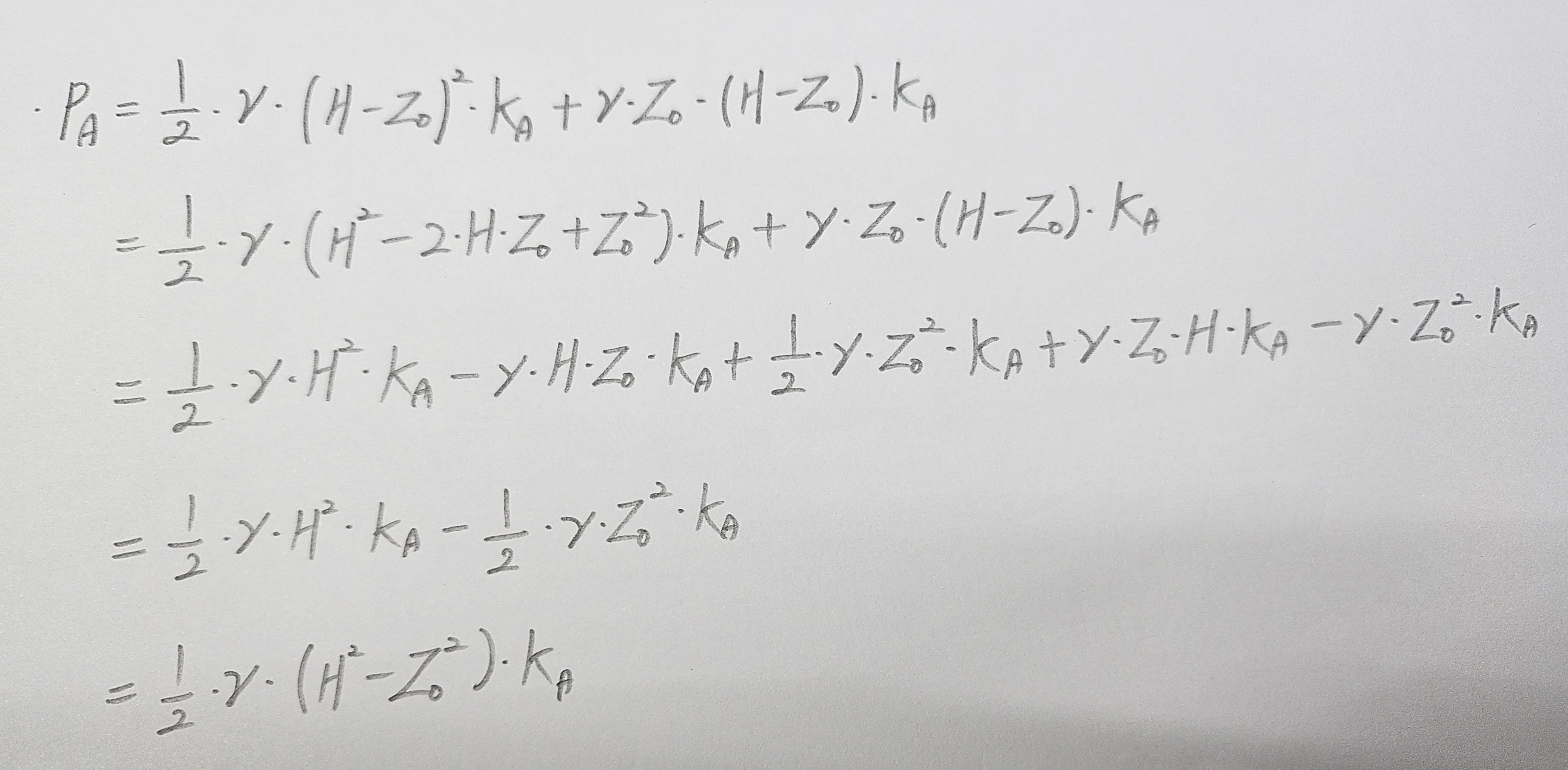 주동토압 공식 중 인장 균열 발생 후, 인장 균열 위의 토압은 무시, 상재하중은 고려한 경우의 공식이