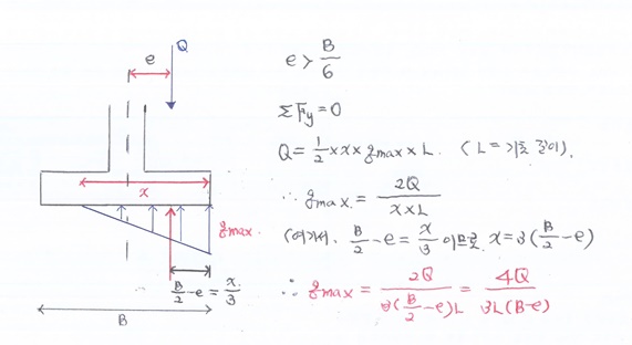 그러므로 지반의 접지압의 분포는 다음과 같고 qmax값은 다음과 같이 유도할수 있습니다.