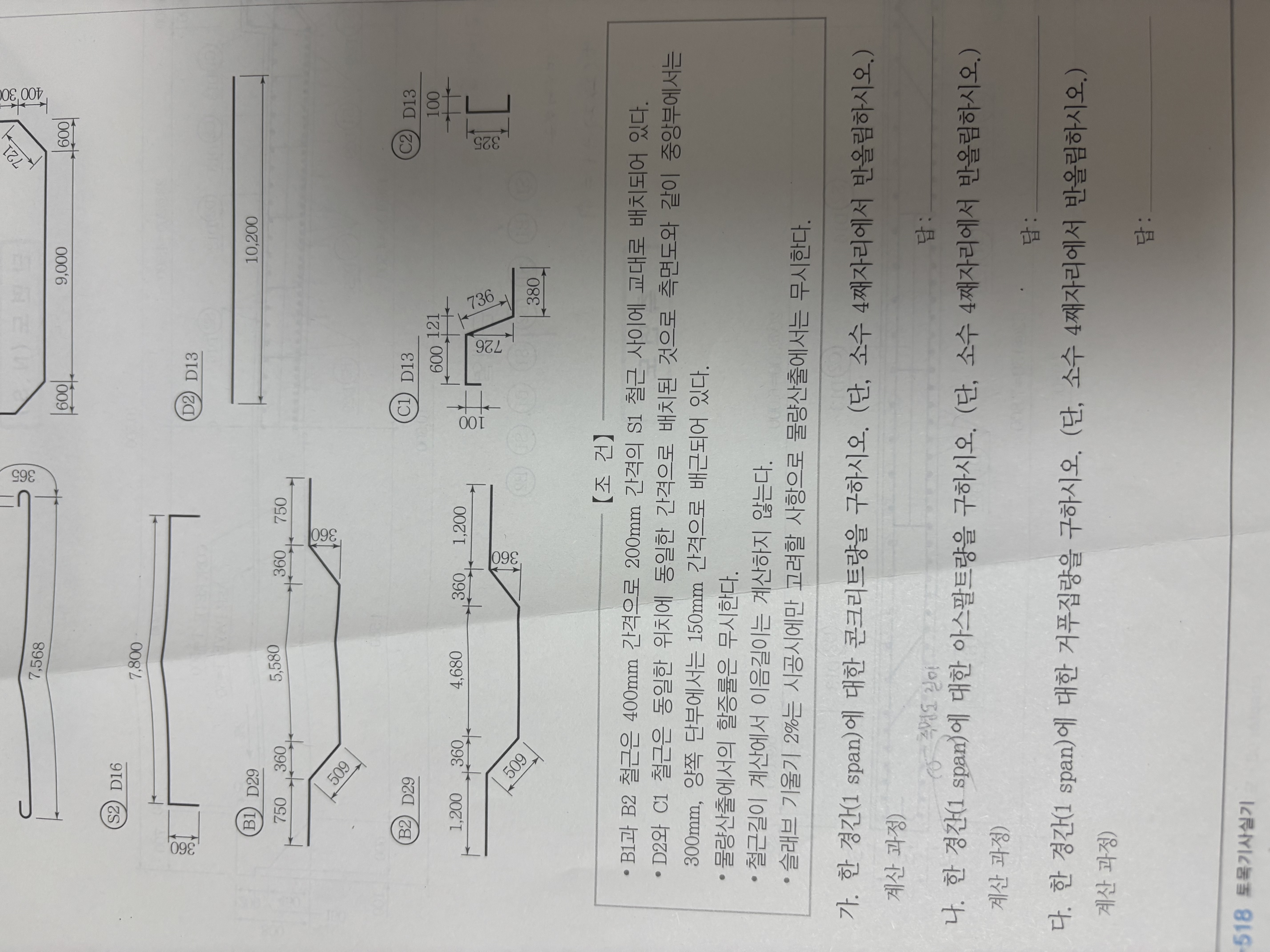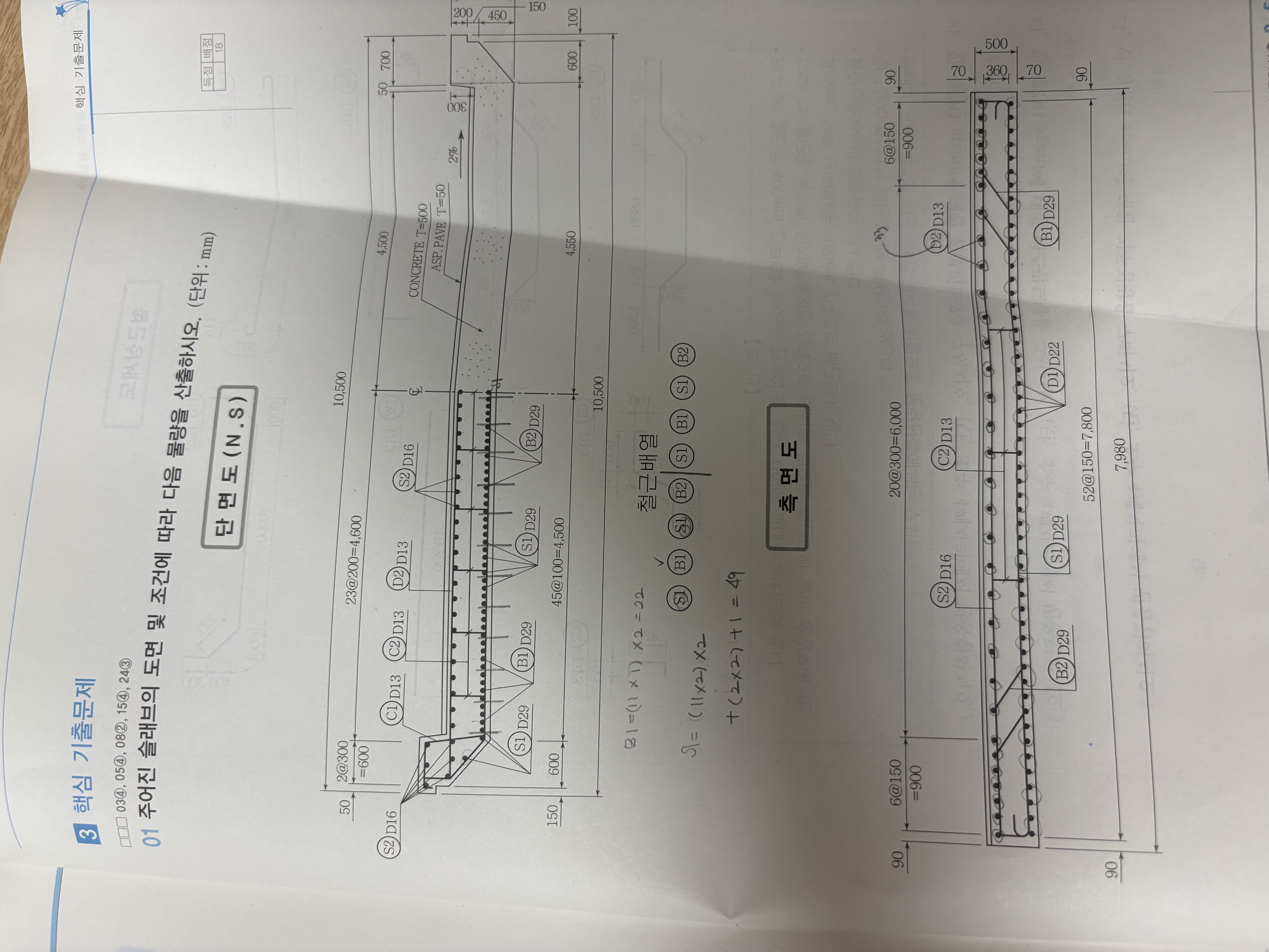 D2의경우 단면도 왼쪽 끝에서부터 오른쪽 끝까지 한줄로 배근된 철근입니다.