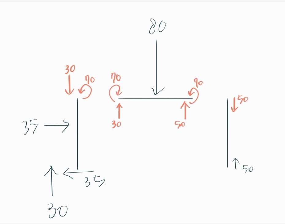 따라서, 수평의 보에서 우측의 상향 50은 존재할 수 있지만, 반시계 70은 존재할 수 없습니다. 이것이 존재한다면 DB구간의 D점에 시계회전 70이 있어야 하며, DB구간의 D점에 시계회전 70이 있다면 B점에 반시계회전 70이 있어야 한다는 것인데, 이동지점이라 존재할 수가 없죠? 뭔가 해석이 잘못되었다는 것입니다.