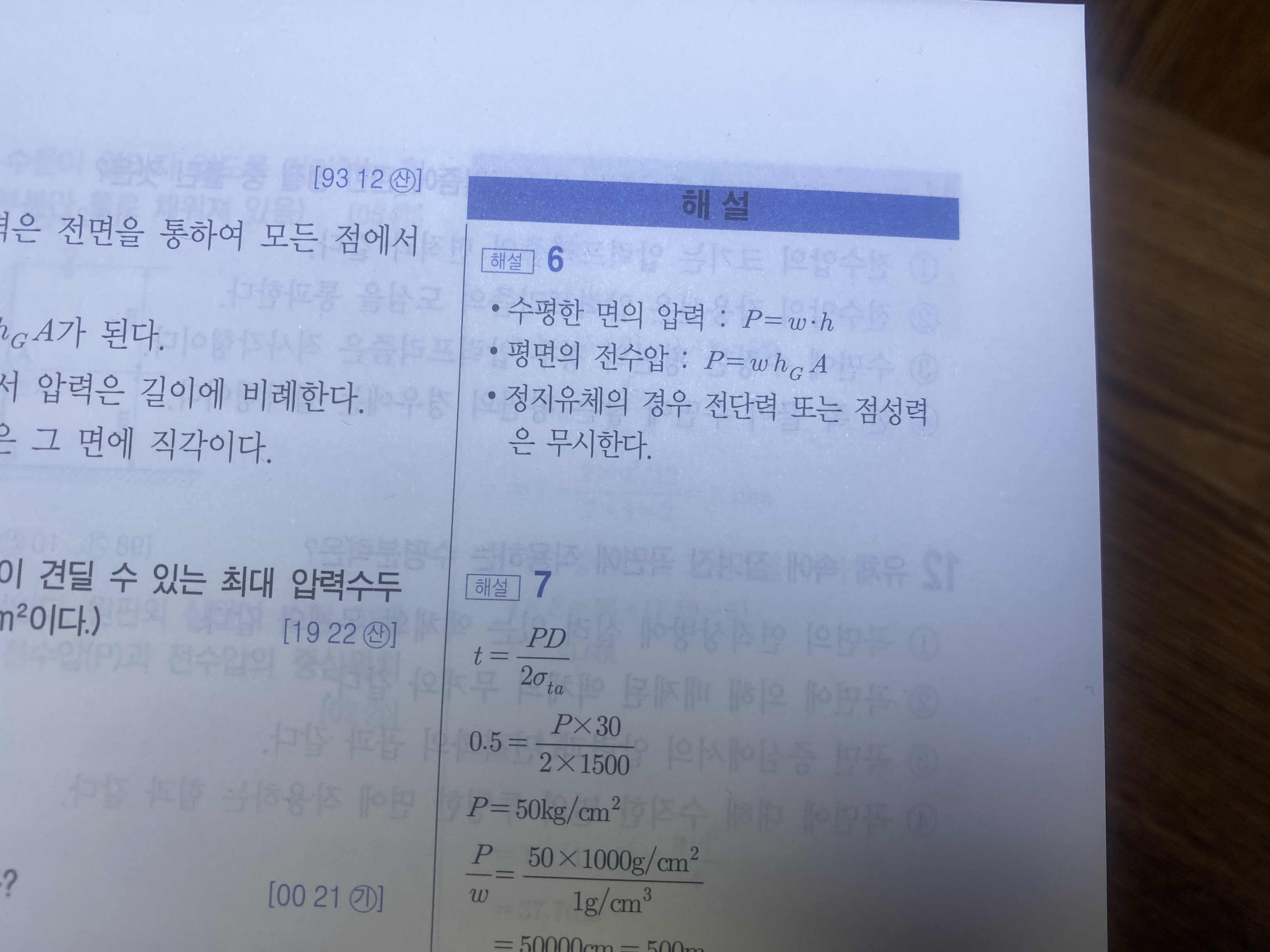 p.31 6번 우측에보면, 수평한 면의 압력이 P = wh 라고 되어있는데,