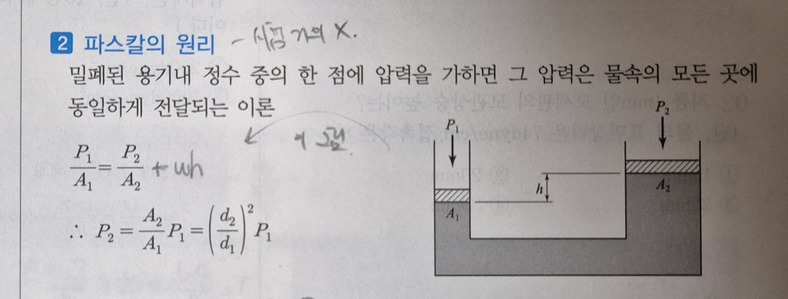 수압은 내려갈수록 커지게 되므로 1번과 2번 지점의 압력이 같아질려면 2번 지점에 ωh를 더해야 됩니다.