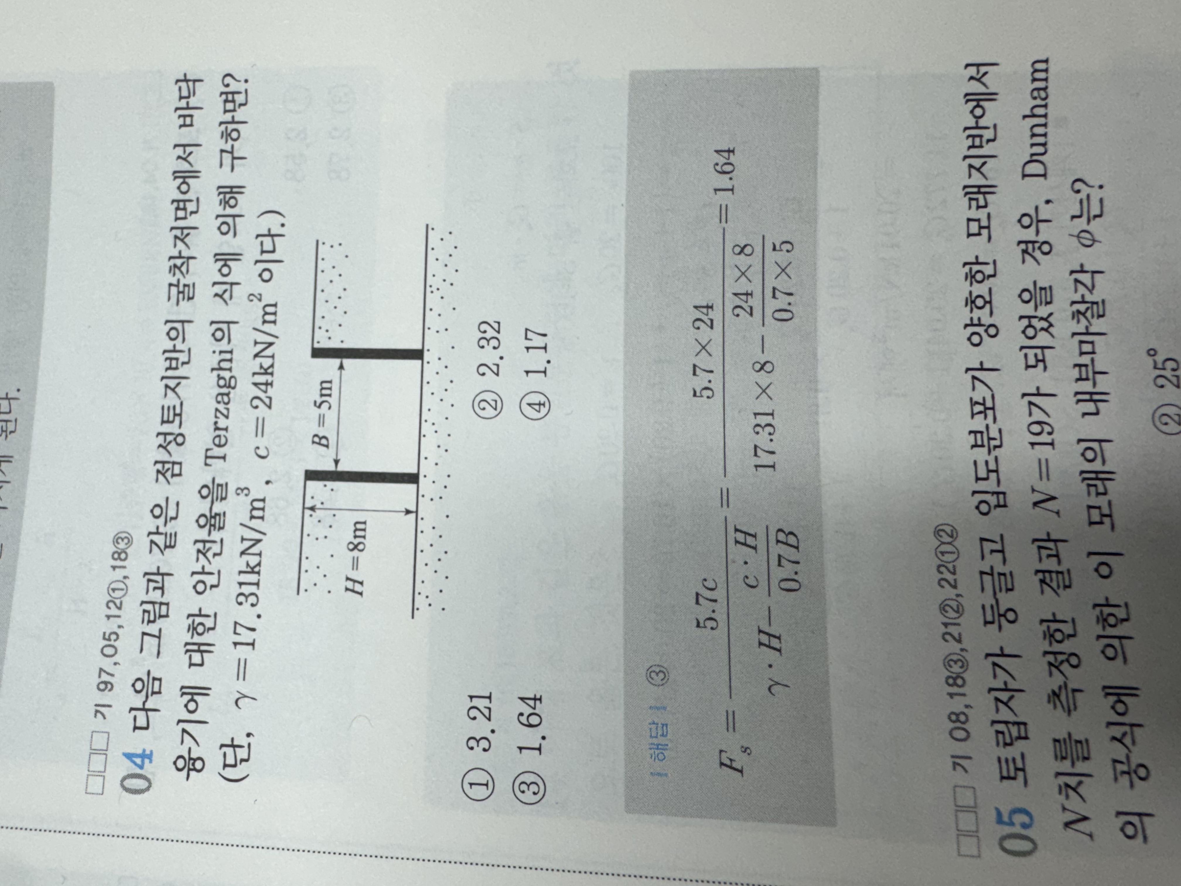 질문하신 내용은 바닥융기(히빙)에대한 안전율을 테르자기가 제한한식(얕은기초의 지지력공식과는 다른공식입니다.)을 적용하는 문제이며, 자주 출제되는 문제가 아니기에 공식이 생소할 수 있습니다.