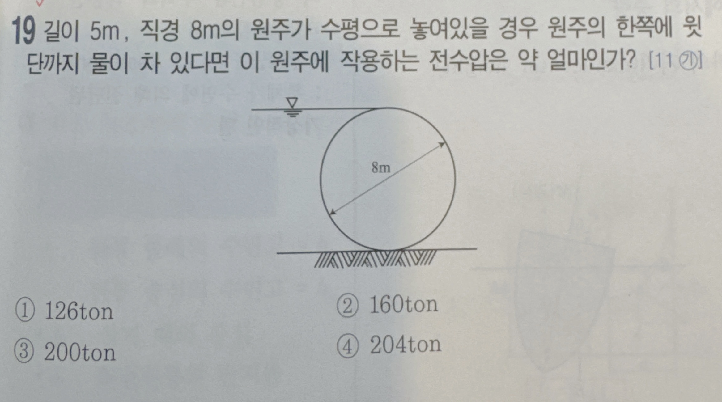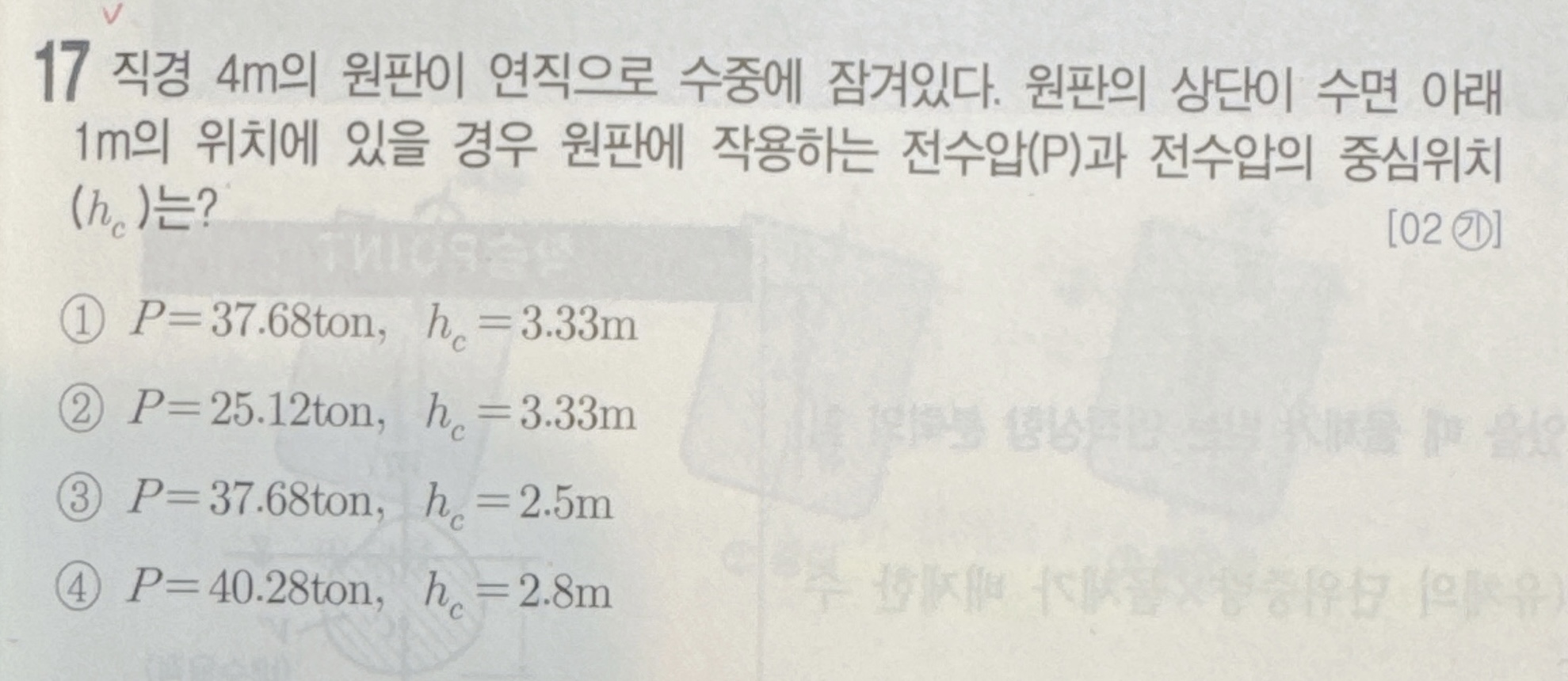 17번 문제는 원판이므로 평면에 작용하는 전수압공식을 사용하며 19번 문제는 원주(원기둥)이므로 곡면에 작용하는 전수압공식을 사용하게 됩니다.