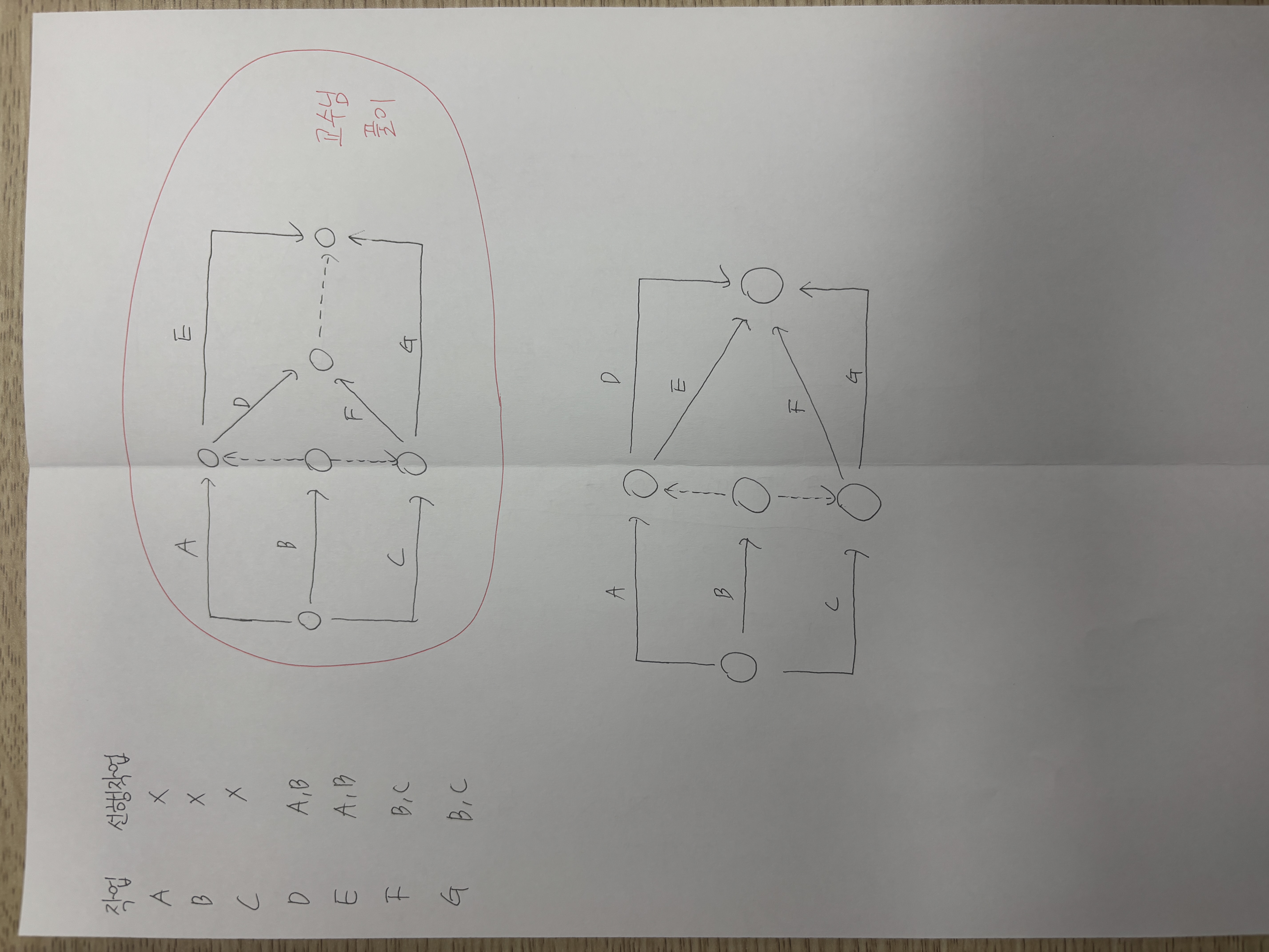 안녕하십니까. 교수님 공정관리 강의를 듣다가 의문이 생겨 글을 쓰게 되었습니다. 다름이 아니라 사진 문제에서 해당 작업에 대한 공정표를 강의에서 교수님께서 위와 같이 더미를 3개를 써서 그려주셨는데 혼자 그리다보니 아래와 같이 더미를 2개를 써서 그렸습니다. 교수님께서 더미는 최대한 적게 써야한다고 하셨는데 더미 2개로 그려지는 것으로보아 제가그린 아래쪽 공정표가 맞는 것이 아닌가 의문이 생겨 글을 쓰게 되었습니다. 혹시 제가 그린 공정표에서 틀린 점이 있으면 궁금합니다.
