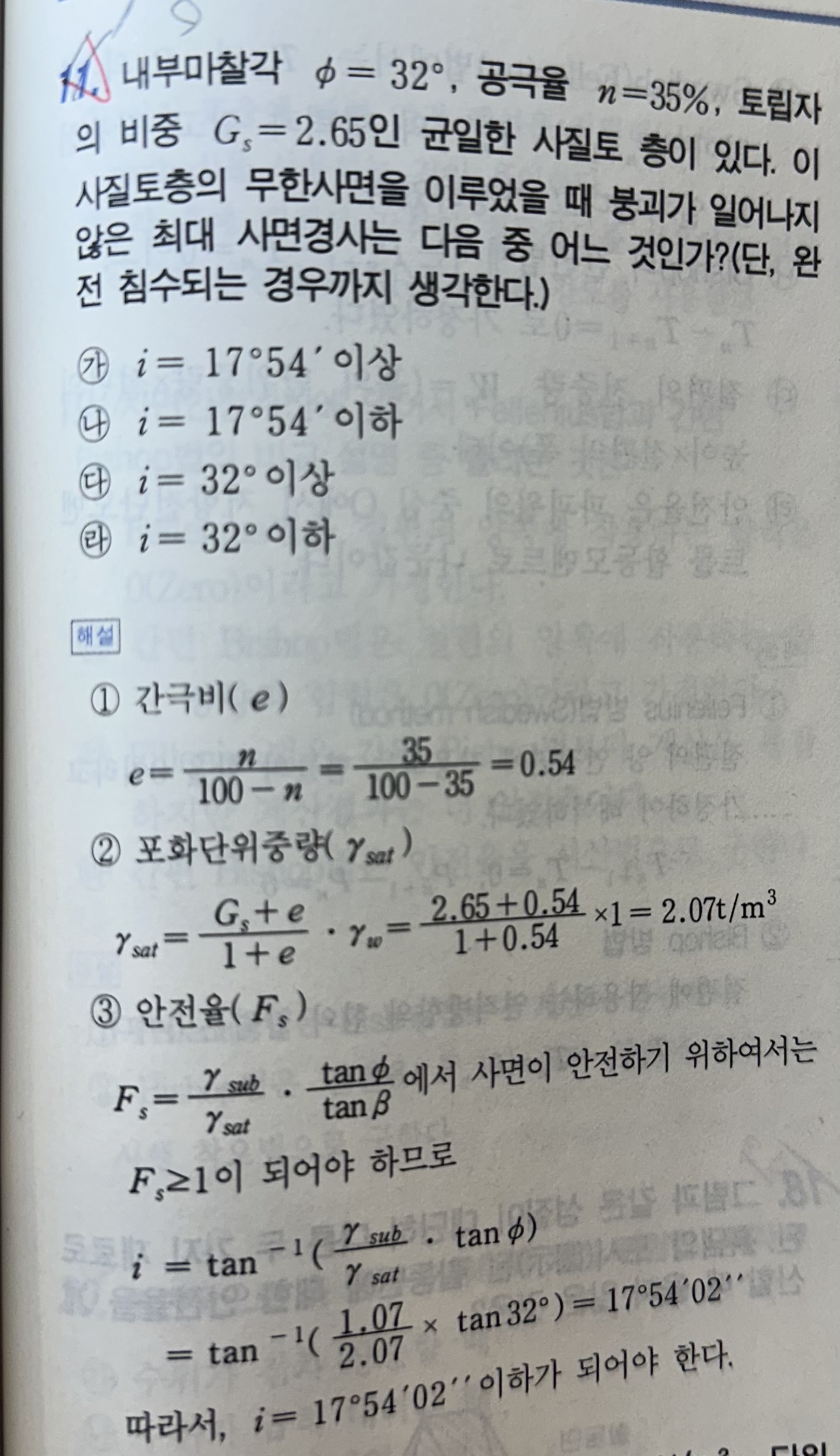 네 님처럼 두 가지(지표면과 지하수면이 일치하는 경우, 수중에 잠긴 경우)를 각각 구해서 비교해서 풀이하는 것이 맞습니다. 교재의 해설에서는 수중에 대한 경우는 해설을 하지 않았습니다.