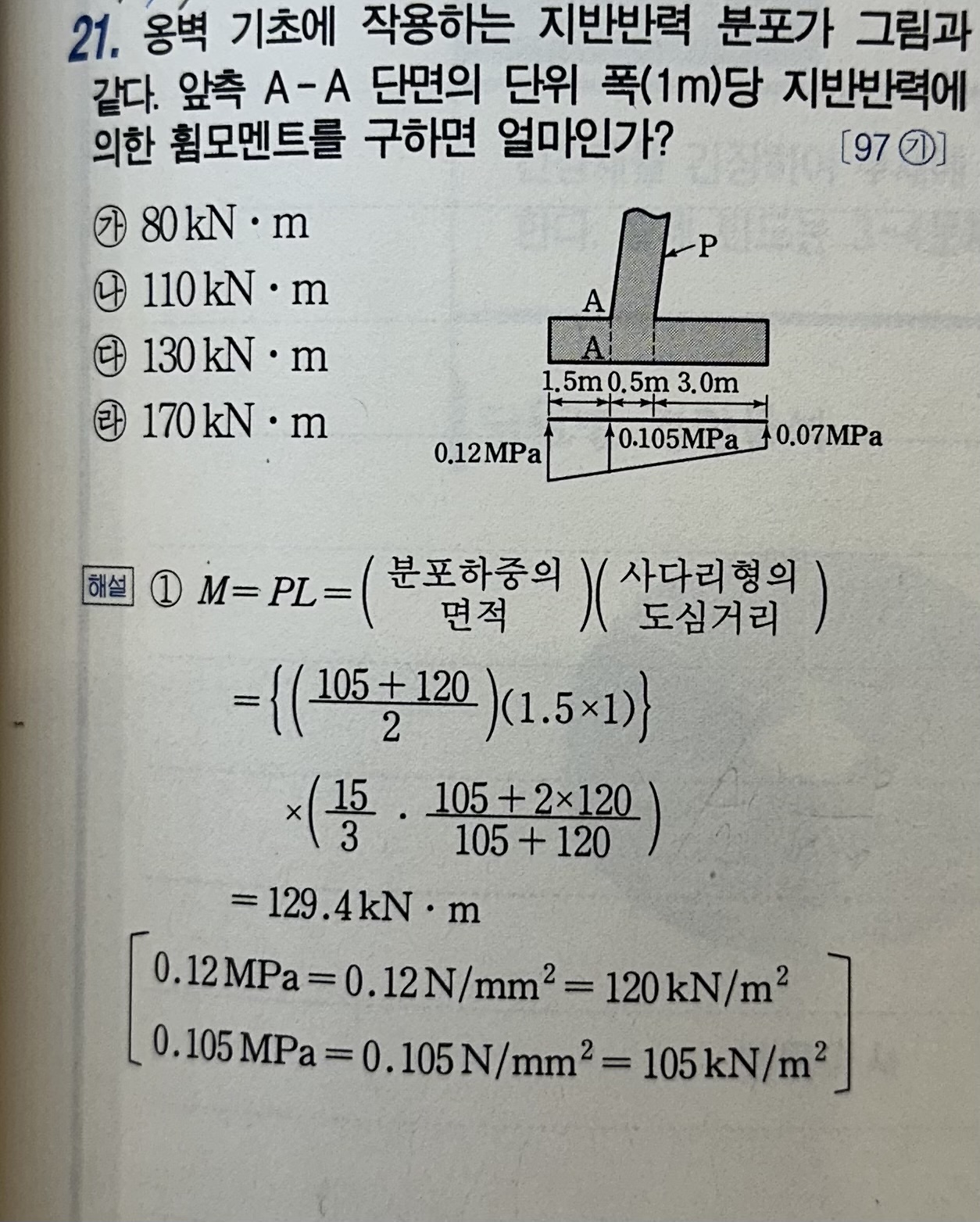 옹벽 a단면의 휨모멘트 구할때 사다리형 도심거리 구하기에서 a에서 잘랐으니까 105x2+120이여야하는거 아닌가요?