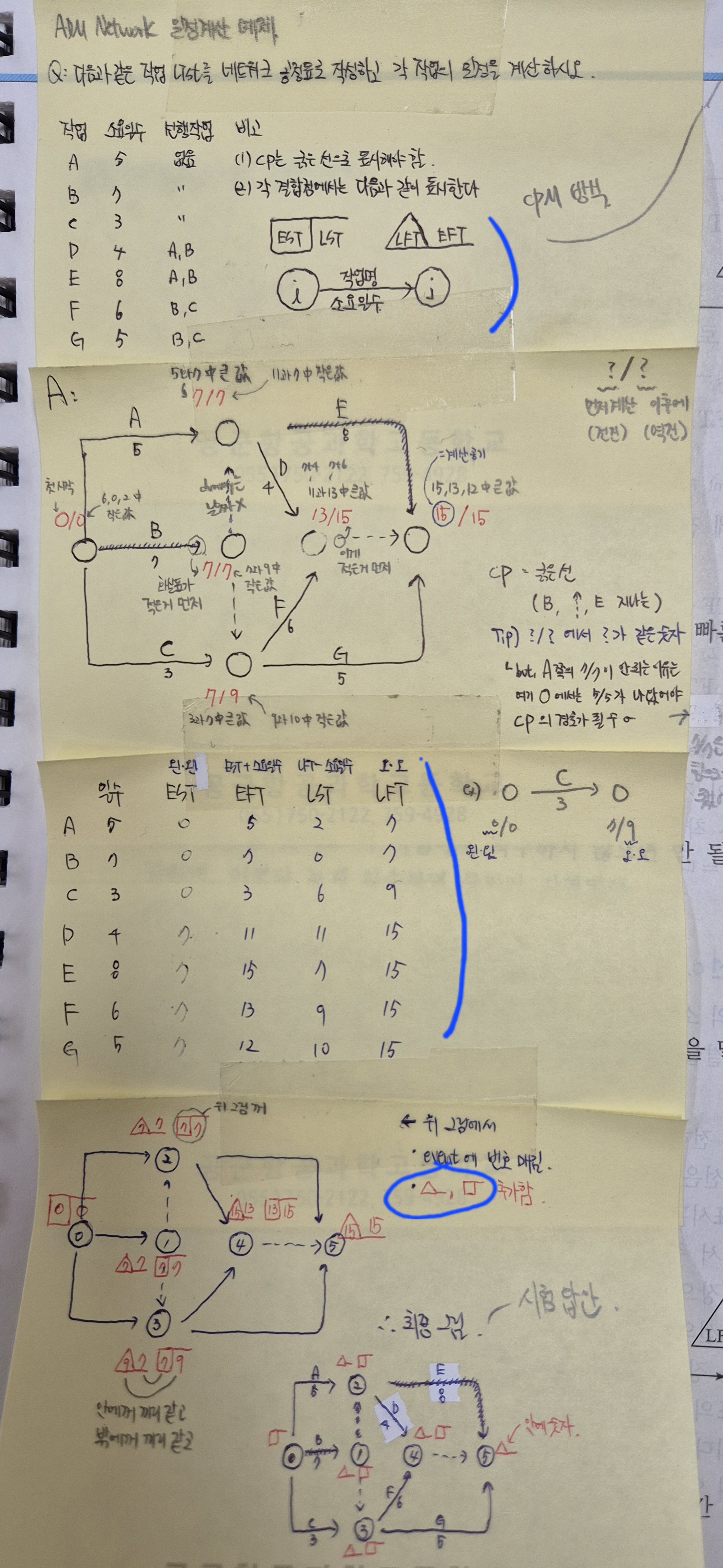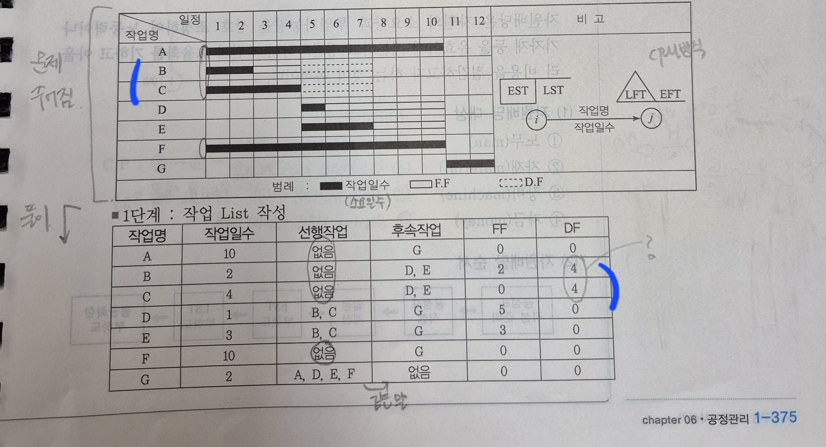 시험문제에서 CPM으로 표현하는 내용 이외에도 표로 EST, EFT, LST, LFT값을 물어보는 문제가 출제되기 때문에 같이 학습해두시기 바랍니다.