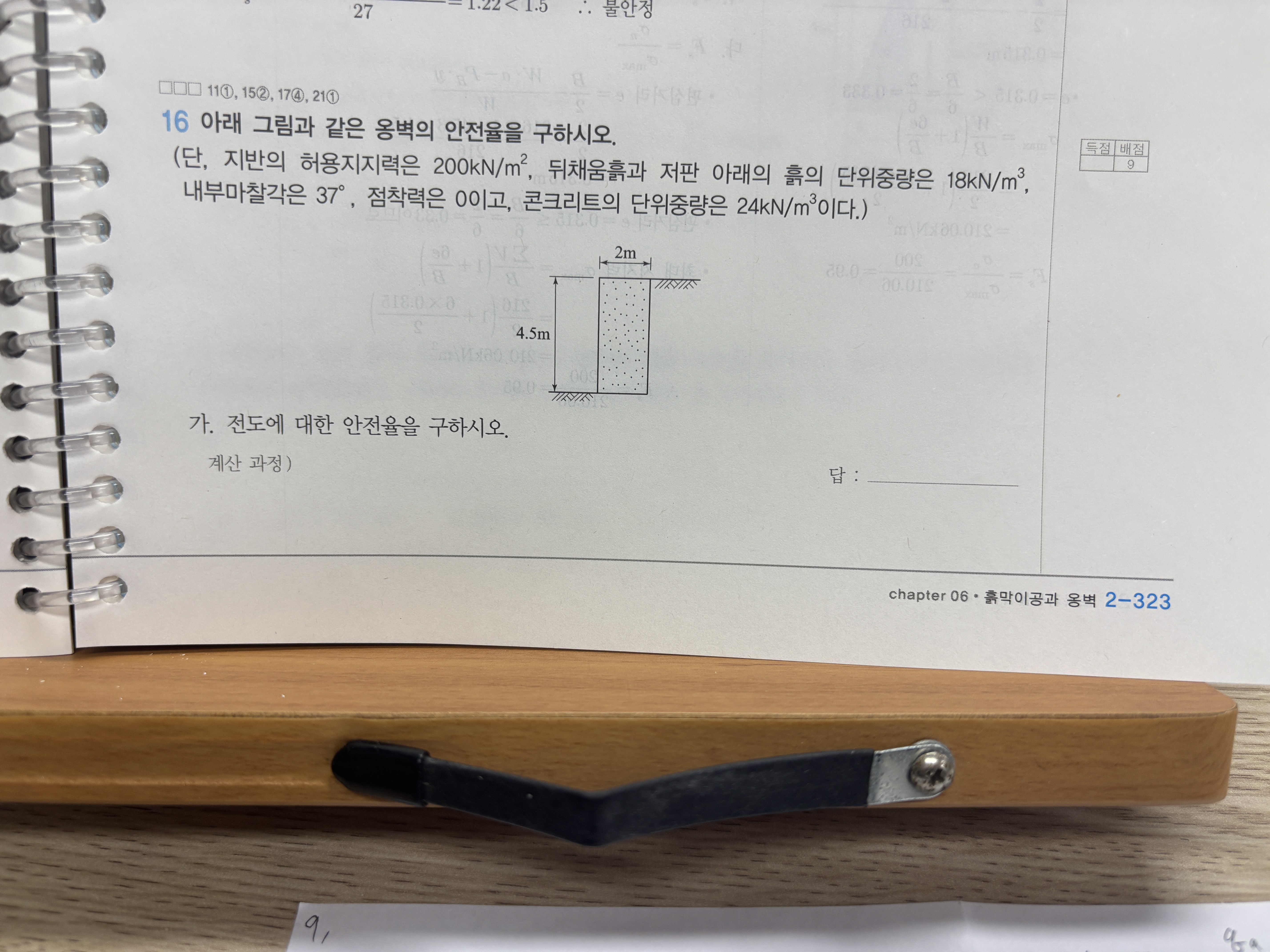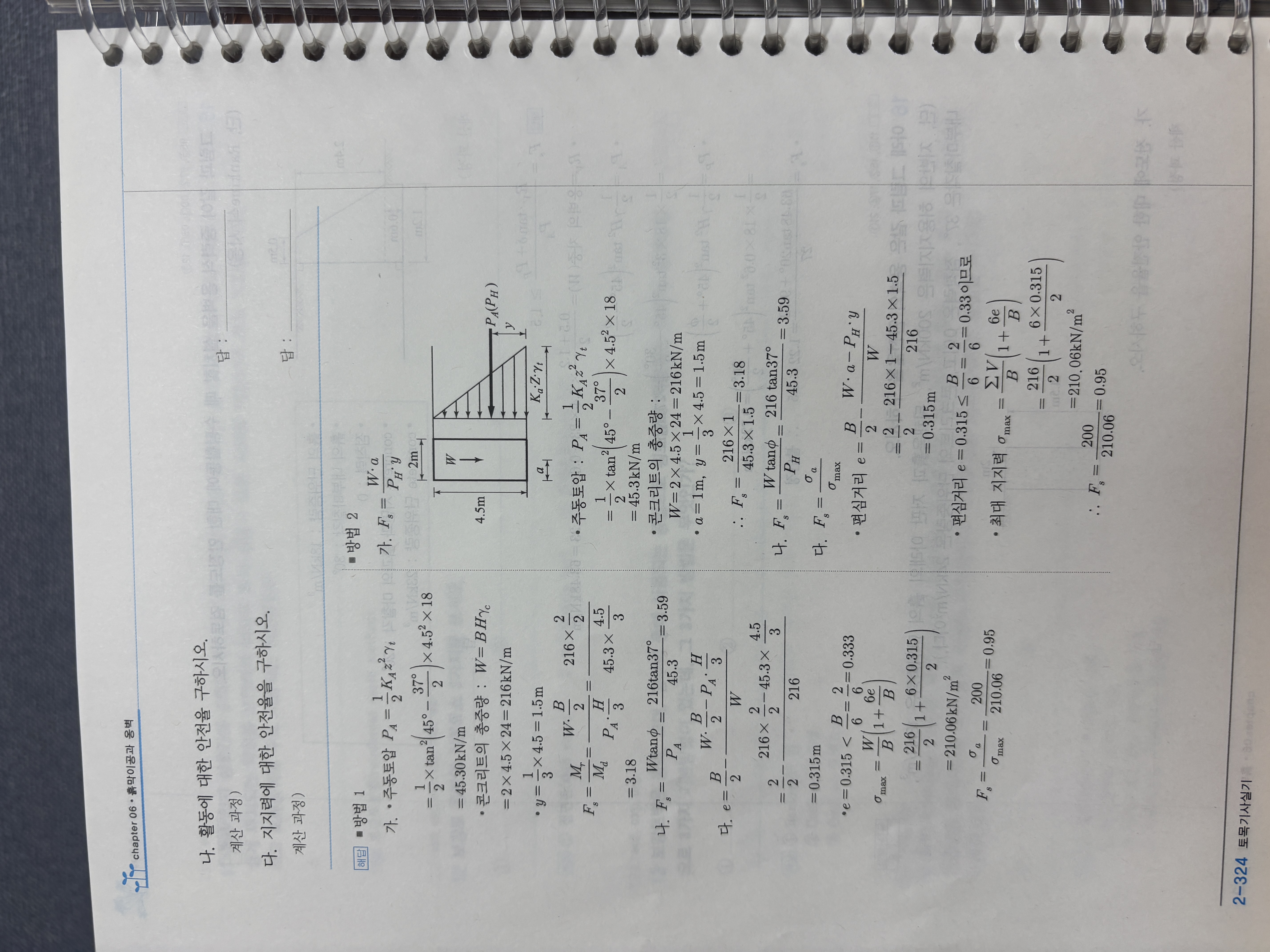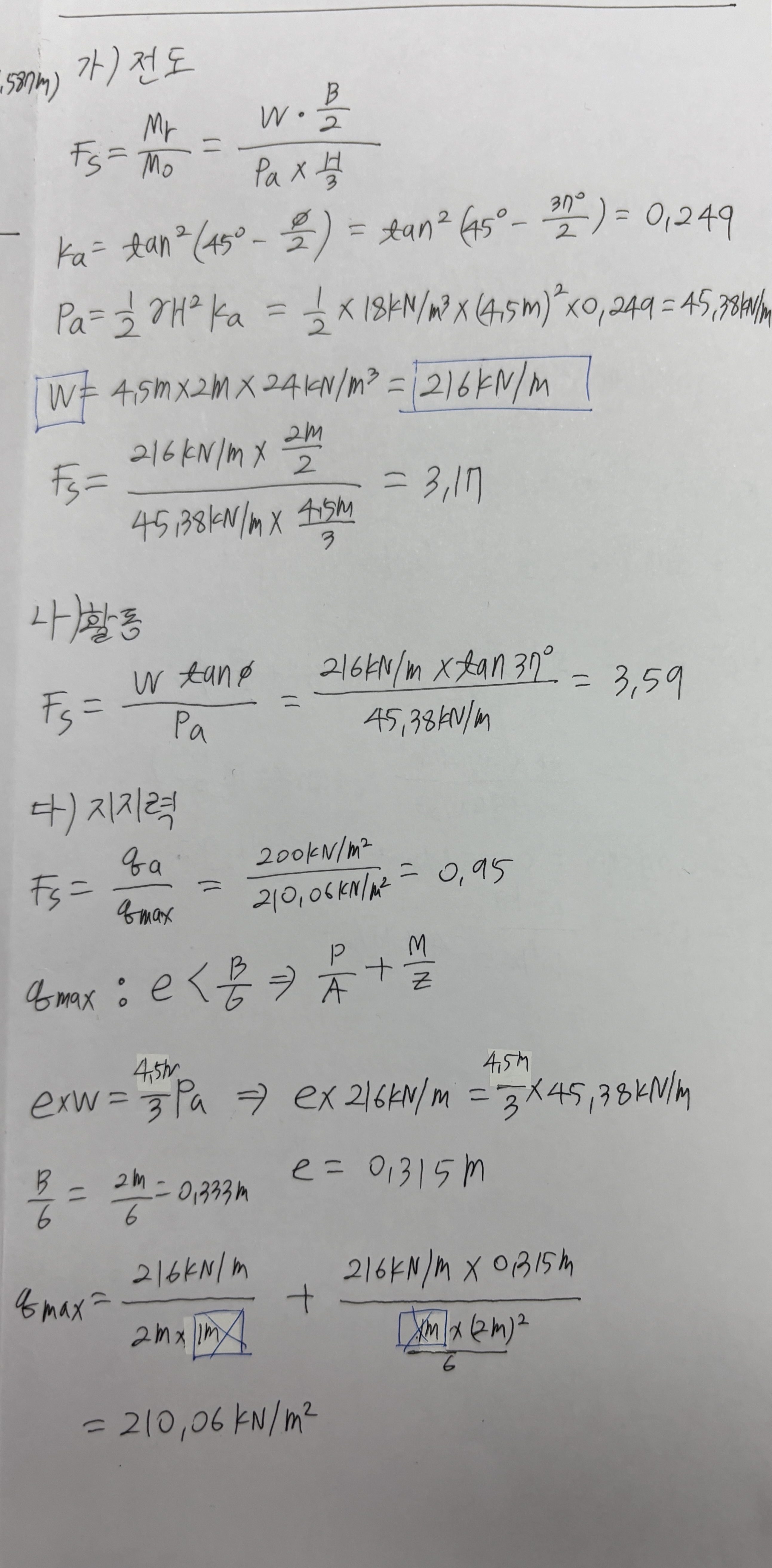 안녕하세요 교수님 지반공학 질문이 있습니다. 아래 사진문제에서 지지력을 구할때 주동토압을 KN/m로 하여 W 단위 또한 KN/m로 했습니다. 즉 이 문제에서 뒷길이를 고려하지 않겠다라는 의미입니다. 따라서 지지력 구할때  qmax 값 공식에서 W/A + M/Z 에서도  A와 Z 값 또한 뒷길이를 포함하지 않아 A는 2m, Z는 2m제곱/6 즉 사진에서 파란색으로  곱표 친 부분은 풀이과정에 적으면 안되는 것이 맞나요??